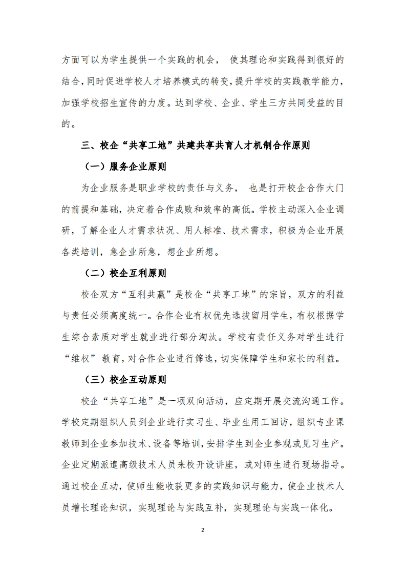 广西理工职业技术学校校企“共享工地”共建共享共育人才机制建设方案为了充分发挥行业、企业在教育改革创新中的作用,促进教育与产业、学校与企业深度合作,加快广西理工职业技术学校建筑类专业建设发展,提高办学综合实力,加强专业师资队伍建设,培养高素质技能人才,给学生提供更广泛的实习和就业机会,为地方经济发展做出更大的贡献,本着互惠互利,共同发展的原则,指导今后的我校校企“共享工地”合作工作,共同努力建设好校企“共享工地”,特制定以下校企“共享工地”共建共享共育人才机制建设方案。一、校企“共享工地”共建共享共育人才机制指导思想积极贯彻落实“以服务为宗旨,以就业为导向,以能力为本位,为生产一线培养高素质应用型技能人才”为培养目标,确立校企合作办学意识,不断探索创新校企合作模式、丰富校企合作内容,提高技能性人才培养的针对性和适应性,提升校企合作办学的层次和水平,推动我系各专业新一轮的内涵发展,不断增强学校服务地方经济建设的能力。二、校企“共享工地”共建共享共育人才机制建设目的通过建立校企“共享工地”,充分开发学生的智力资源,一方面可以为企业的发展提供建设性意见,使企业能够充分利用学校的各种资源,为企业的发展储备所需的专业人才,扩大企业的知名度,另一