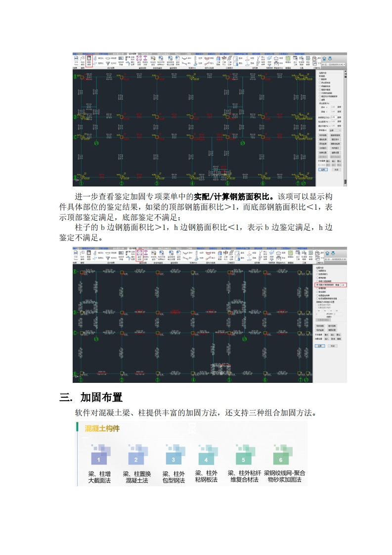 混凝土结构加固设计实例李伟民住房城乡建设部部长倪虹表示,2025年将大力实施城市更新。一是坚持“先体检、后更新,无体检、不更新”,建立城市体检和城市更新一体化推进机制。二是加大对城镇老旧小区改造、城中村改造、危旧住房改造等城市更新项目的支持力度。其中,既有建筑检测鉴定之后,需要对其进行加固设计。下面采用YJK软件对某一既有房屋进行加固设计,并生成加固施工图。一.工程概况本工程为河北地区某一混凝土框架结构房屋,该建筑建造于1996年,其抗震设防类别为丙类,抗震等级为三级,抗震设防烈度为7度,Ⅱ类场地,地震分组为第三组。业主考虑到其房屋使用年限已久,担心存在安全隐患,采用YJK软件已完成安全鉴定与抗震鉴定,其鉴定报告可详见技术期刊《混凝土结构安全鉴定及抗晨鉴定实例》。现依据该房屋的鉴定结果,结合DWG图纸信息及现场检测数据,采用YJK软件进行加固设计,并生成加固施工图。由于鉴定阶段已经生成模型并录入了构件的实配钢筋,所以可直接在鉴定模型基础上进行加固设计,现复制一份鉴定模型出来作为本项目的加固模型。二.加固依据根据软件的鉴定结果进行加固设计,目前有两种思路:一是根据鉴定报告,对安全鉴定评为cu、du的构件及抗震鉴定不通过的构件进行加固设计。二是根据全组合下的钢筋面积鉴定(构件的钢筋计算面积大于实配面积时,配筋简图就会显红,该构件可评定为鉴定不满足要求)进行加固设计。以目前收集到的工程反馈来看,多数设计师习惯采用钢筋面积鉴定结果来判断是否需要加固,因此本模型依据钢筋面积鉴定结果进行加固设计。首先,查看设计结果一一配筋简图,显红的构件表示鉴定不满足。