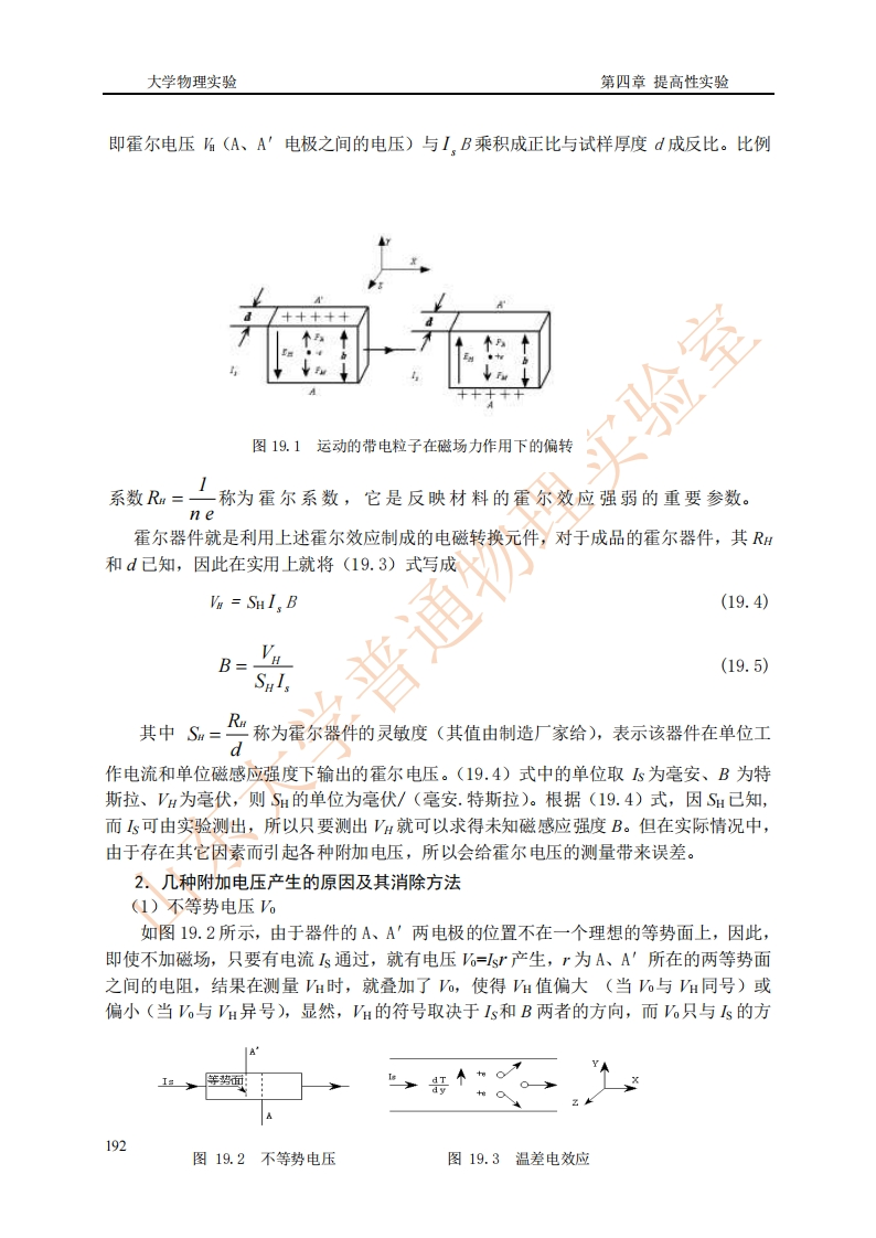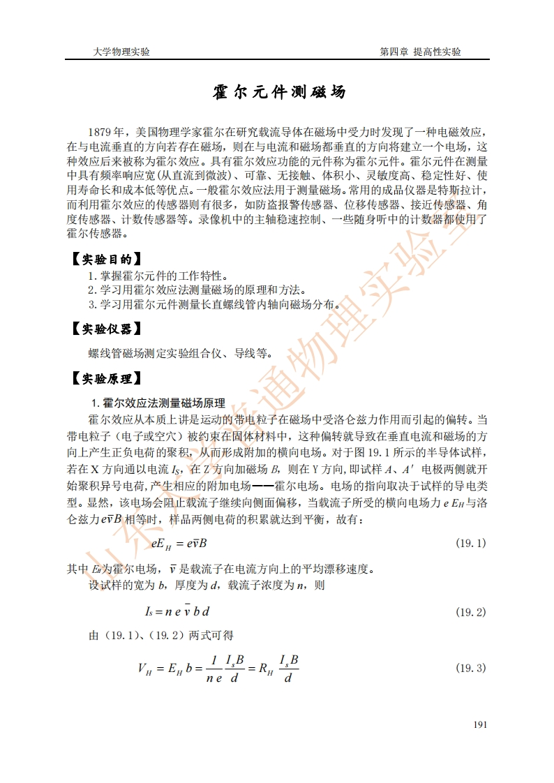 大学物理实验第四章提高性实验霍尔元件测磁场1879年,美国物理学家霍尔在研究载流导体在磁场中受力时发现了一种电磁效应,在与电流垂直的方向若存在磁场,则在与电流和磁场都垂直的方向将建立一个电场,这种效应后来被称为霍尔效应。具有霍尔效应功能的元件称为霍尔元件。霍尔元件在测量中具有频率响应宽(从直流到微波)、可靠、无接触、体积小、灵敏度高、稳定性好、使用寿命长和成本低等优点。一般霍尔效应法用于测量磁场。常用的成品仪器是特斯拉计,而利用霍尔效应的传感器则有很多,如防盗报警传感器、位移传感器、接近传感器、角度传感器、计数传感器等。录像机中的主轴稳速控制、一些随身听中的计数器都使用了霍尔传感器。【实验目的】1.掌握霍尔元件的工作特性。2.学习用霍尔效应法测量磁场的原理和方法。3.学习用霍尔元件测量长直螺线管内轴向磁场分布【实验仪器】螺线管磁场测定实验组合仪、导线【实验原理】通物理实验1.霍尔效应法测量磁场原理霍尔效应从本质上讲是运动的带电粒子在磁场中受洛仑兹力作用而引起的偏转。当带电粒子(电子或空穴)被约束在固体材料中,这种偏转就导致在垂直电流和磁场的方向上产生正负电荷的聚积,从而形成附加的横向电场。对于图19.1所示的半导体试样,若在X方向通以电流s,在Z方向加磁场B,则在Y方向,即试样A、A'电极两侧就开始聚积异号电荷,产生相应的附加电场一一霍尔电场。电场的指向取决于试样的导电类型。显然,该电场会阻止载流子继续向侧面偏移,当载流子所受的横向电场力EH与洛仑兹力下B相等时,样品两侧电荷的积累就达到平衡,故有:eEu=evB(19.1)其中为霍尔电场,下是载流子在电流方向上的平均漂移速度。设试样的宽为b,厚度为d,载流子浓度为n,则Is=nevbd(19.2)由(19.1)、(19.2)两式可得=5,b=号=R,号(19.3)ne d191