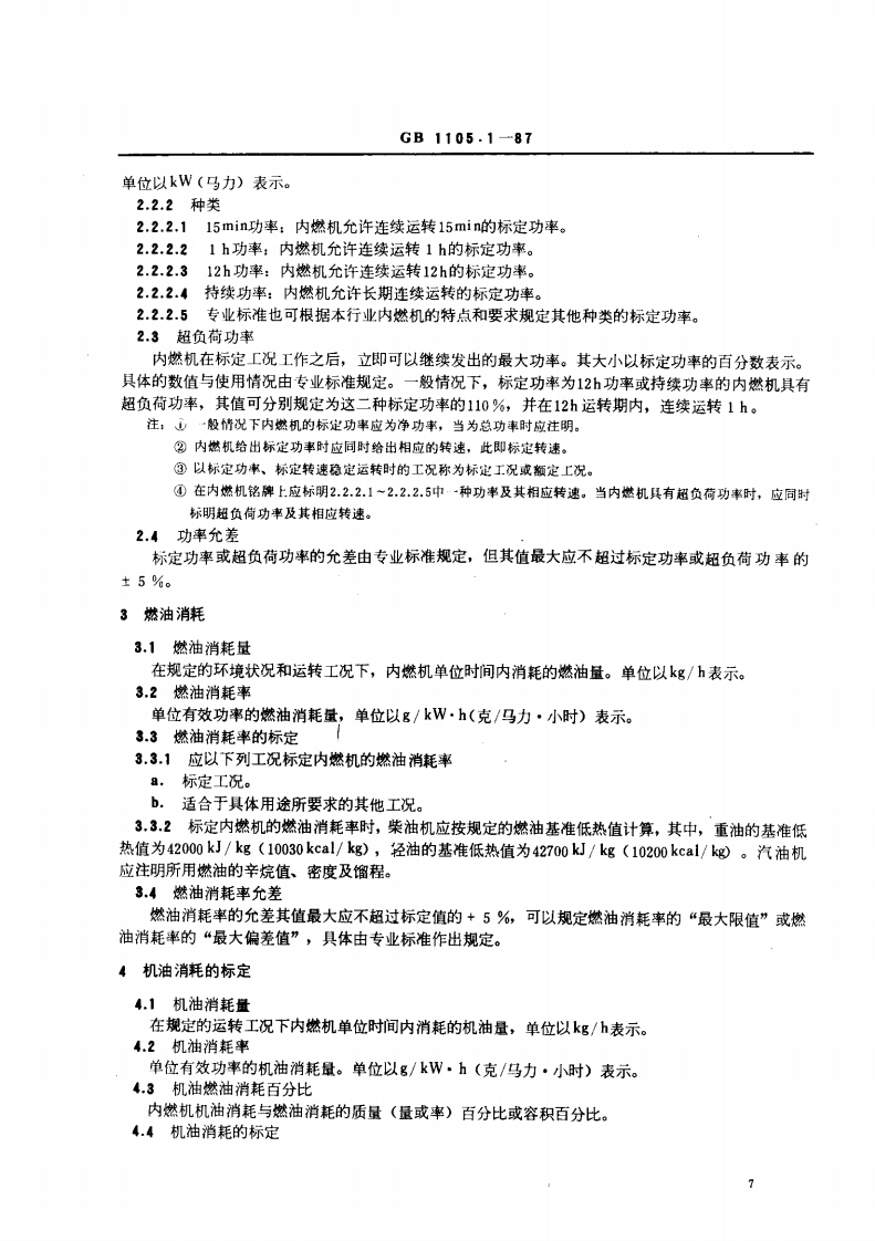 中华人民共和国国家标准内燃机台架性能试验方法标准环境状况及功率、UDC621.43.018燃油消耗和机油消耗的标定GB1105.1-87Performance test methods for代替GB1105一74reciprocating internal combustion engineStandard amblent conditions anddeclarations of power,fuel consumptionand lubricating oil consumption本标准规定了一般用途的往复活塞式柴油机和汽油机的标准环境状况及功率、燃油消耗和机油消耗的标定方法。1标准环境状况大气压p=100kPa(750mmHg)相对湿度中0=30%环境温度T。=298K或25℃中冷器冷却介质进口温度Tc0=298K或25℃注:心当T。=298K或25℃,中。=30%时,水紫汽分压中0pw。=1kPa(7.5mmHg),标准环境状况下干空气压ps。=9kPa(742.5mmHg)。p,n为标准环境状况下的饱和燕汽压,单位以kPa(mmHg)表示。②环境温度即进气温度。③对于特殊使用环境的内燃机,可以补充规定其他的环境状况,但应加以说明。并经有关主管部门批准例如应用于“无限航区”的船用内燃机(主机和辅机)应遵循国际船级协会(IACS)规定的环境状况:大气压户x=100kPa(750mmHg)。相对湿度中x=60%环境温度Tx=318K或45℃中冷器冷却介质进口温度Tcx=305K或32℃2功率的标定2.1功率的类别2.1.1指示功率:工作气缸内,气体的压力作用在工作活塞上发出的全部功率。单位以kW(马力)表示。2.12有效功率:动力输出轴输出的功率。单位以kW(马力)表示。2.1.2.1总功率:内燃机带有维持本身正常运转所需附件的有效功率。2,1.22净功率:内燃机按不同用途带有实际工作所需全部附件的有效功率。2.2标定功率(额定功率)2.2.1定义标准环境状况下,制造厂根据内燃机的用途和特点在标定转速(额定转速)下所规定的有效功率。国家标准局1987-01-12批准1987-10-01实施