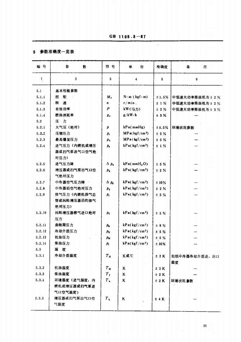 中华人民共和国国家标准UDC621.43内燃机台架性能试验方法测量技术GB1105.3-87P erformance test methods for代棒GB1105-74reciprocating internal combustion engineMeasurement techniques本标准规定了一般用途的往复活塞式柴油机和汽油机主要参数的一般测量技术和准确度。1适用工况本标准主要适用于GB1105.1一87中2.2及2.3规定的标定(额定)工况和超负荷功率工况。测量仪器设备的容仗、量程和精确度均应按内燃机的这二种工况选定。其余工况可根据具体情况予以选择应用。2测量条件2.1测情前,应先使内燃机在规定的工况下进行较长时间的运转,以保证各处的工作温度达到制造厂规定的稳定状态。·2.2测量过程中,内燃机不得进行任何调整(试验项目要求调整者除外)。2,3测量时各项参数应保持在本标准第5章规定的准确度范围内。3测量方法3.1测量方法(包括使用的仪表)可由各专业标准或制造厂规定。必要时,可由制造与用户、检验单位之间商定。32测量位置可由各专业标准或制造厂规定,如无资料可循,亦可按附录A(参考件)推荐的位置选定。4测量准确度41本标准规定的利量准确度是指综合了仪器仪表、测量位置、使用条件以及试验结果整理等项误差后参数的准确程度。专业标准也可只规定仪器仪表精确度。42所确定的参数准确度,一般情况下适用于产品的定型试骏、验收试验和定期抽查试验。如对其有较高要求时,专业标准或制造厂可另行规定。4.3为保证主要参数的测量准确度,应对所用仪器仪表的精确度作出相应规定。如无资料可循亦可参照附录B(参考件)。4.4试验前,使用的测试设备、仪器仪表均应采用正确的方法,在整个读数范围内检验和校准,并附有校验合格证。国家标准局1987-01-12批准1987-10-01实施34