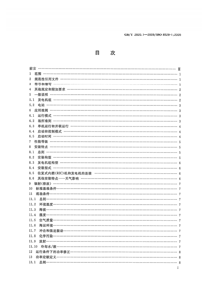 1Cs29.160.40K52中华人民共和国国家标准GB/T2820.1-2009/1S08528-1:2005代替GB/T2820.1-1997往复式内燃机驱动的交流发电机组第1部分:用途、定额和性能Reciprocating internal combustion engine driven alternatingcurrent generating sets-Part 1:Application,ratings and performance(IS08528-1:2005,IDT)2009-05-06发布2009-11-01实施中华人民共和国国家质量监督检验检疫总局防份中国国家标准化管理委员会发布