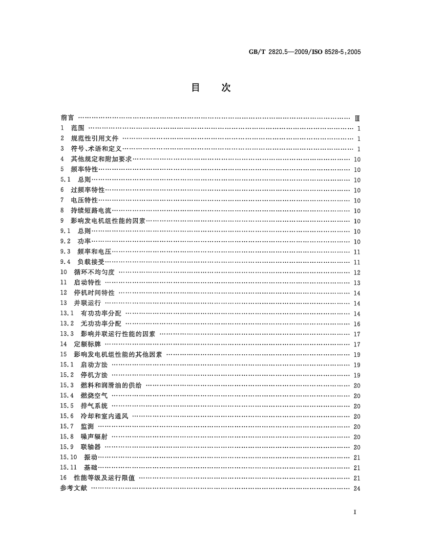 kK29.160.40中华人民共和国国家标准GB/T2820.5-2009/IS08528-5:2005代替GB/T2820.5一1997往复式内燃机驱动的交流发电机组第5部分:发电机组Reciprocating internal combustion engine driven alternatingcurrent generating sets-Part 5:Generating sets(IS08528-5:2005,IDT)2009-05-06发布2009-11-01实施中华人民共和国国家质量监督检验检疫总局中国国家标准化管理委员会发布