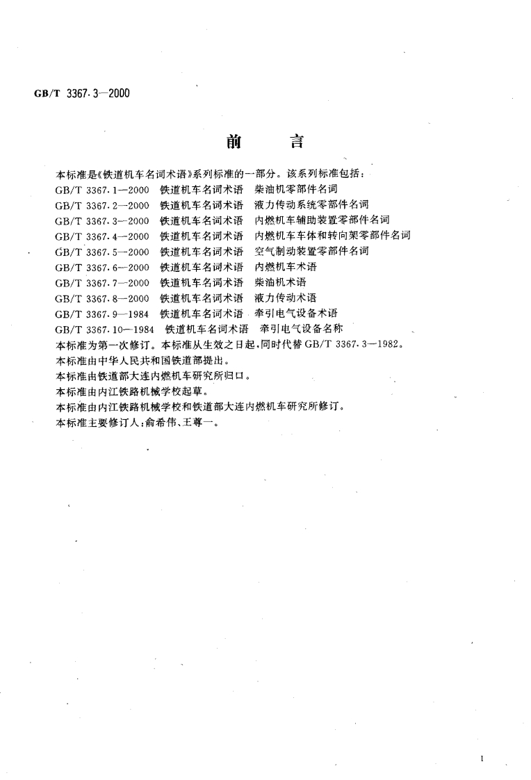 GBT3367.3-2000铁道机车名词术语内燃机车辅助装置零部件名词348072@abc4个月前发布关注私信0.30MB11页033GBT3367.3-2000铁道机车名词术语内燃机车辅助装置零部件名词此内容为付费资源,请付费后查看¥11¥16黄金会员免费钻石会员免费立即购买您当前未登录!建议登陆后购买,可保存购买订单付费资源 第1页 / 共11页 第2页 / 共11页 试读已结束,还剩9页,您可下载完整版后进行离线阅读 THE END标准规范 文本预览 1Cs01.040.45s40GB中华人民共和国国家标准GB/T3367.3-2000铁道机车名词术语内燃机车辅助装置零部件名词Glossary of terms for railway locomotiveNames of component parts for diesellocomotive auxiliary device2000-10-25发布2001-08-01实施国家质量枝术监督局发布 查看更多 收起部分 喜欢就支持一下吧收藏