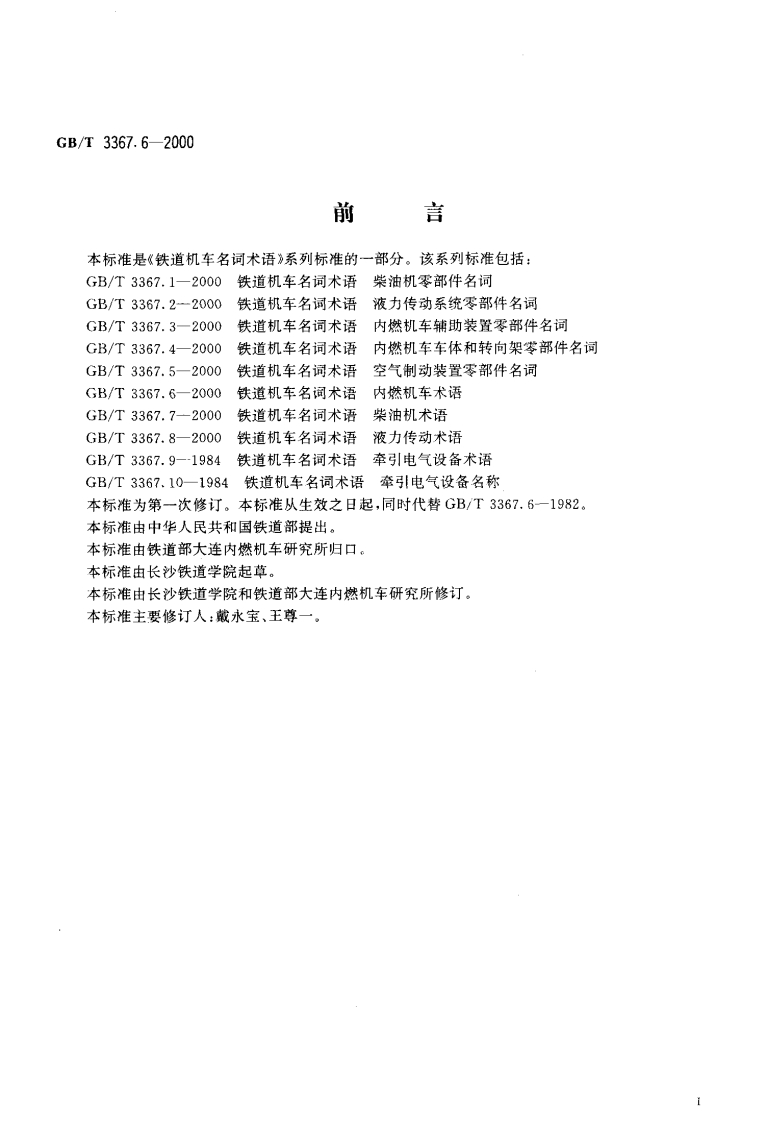 GBT3367.6-2000铁道机车名词术语内燃机车术语348072@abc4个月前发布关注私信0.48MB13页022GBT3367.6-2000铁道机车名词术语内燃机车术语此内容为付费资源,请付费后查看¥11¥16黄金会员免费钻石会员免费立即购买您当前未登录!建议登陆后购买,可保存购买订单付费资源 第1页 / 共13页 第2页 / 共13页 试读已结束,还剩11页,您可下载完整版后进行离线阅读 THE END标准规范 文本预览 1Cs01.040.45S40B中华人民共和国国家标准GB/T3367.6-2000铁道机车名词术语内燃机车术语Glossary of terms for railway locomotiveTerms of diesel locomotive2000-10-25发布2001-08-01实施国家质量技术监督局发布 查看更多 收起部分 喜欢就支持一下吧收藏