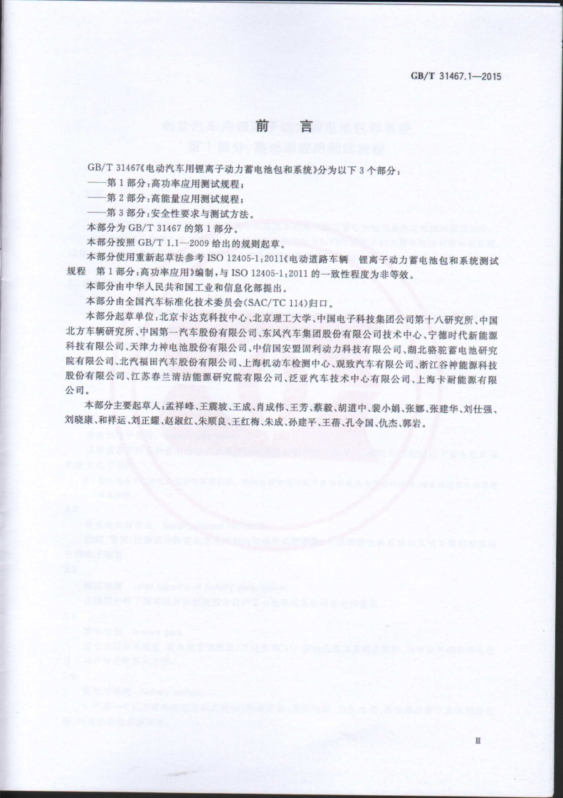 I1CS43.080T47GB中华人民共和国国家标准GB/T31467.1-2015电动汽车用锂离子动力蓄电池包和系统第1部分:高功率应用测试规程Lithium-ion traction battery pack and system for electric vehicles-Part 1:Test specification for high power applications(ISO 12405-1:2011,Electrically propelled road vehicles-Test specification for lithium-ion traction battery packs and systems-Part 1:High-power applications,NEQ)2015-05-15发布2015-05-15实施Φ中华人民共和国国家质量监督检验检疫总局中国国家标准化管理委员会发布