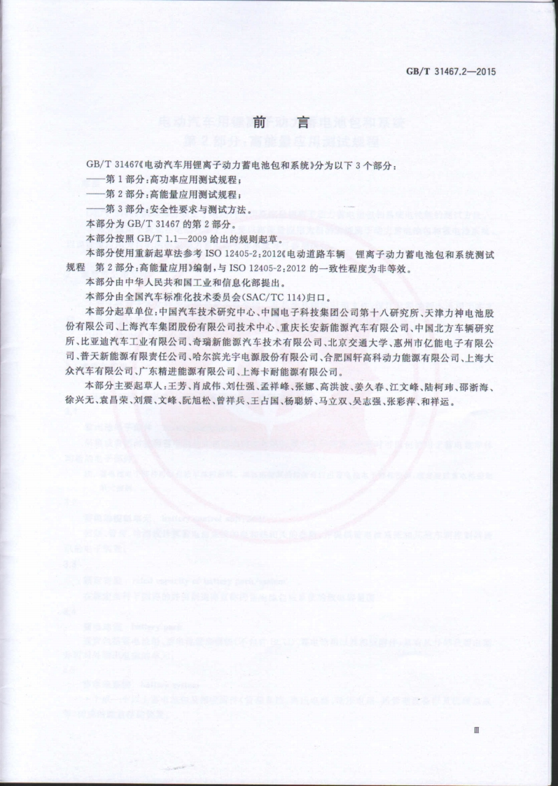 I1CS43.080T47GB中华人民共和国国家标准GB/T31467.2-2015电动汽车用锂离子动力蓄电池包和系统第2部分:高能量应用测试规程Lithium-ion traction battery pack and system for electric vehicles-Part 2:Test specification for high energy applications(ISO 12405-2:2012,Electrically propelled road vehicles-Test specification for lithium-ion traction battery packs and systems-Part 2:High-energy applications,NEQ)2015-05-15发布2015-05-15实施中华人民共和国国家质量监督检验检疫总局中国国家标准化管理委员会发布
