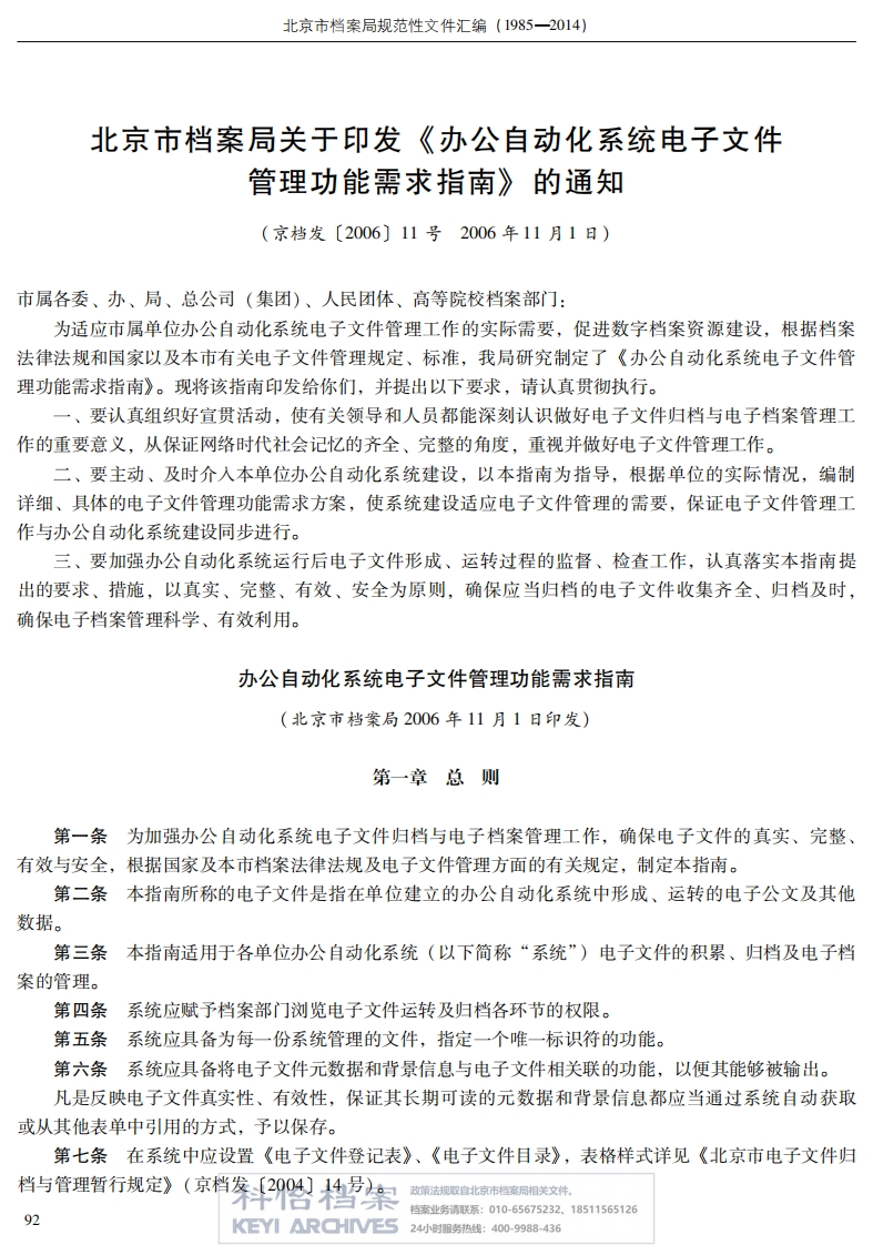 北京市档案局规范性文件汇编(1985一2014)】北京市档案局关于印发《办公自动化系统电子文件管理功能需求指南》的通知(京档发〔2006〕11号2006年11月1日)市属各委、办、局、总公司(集团)、人民团体、高等院校档案部门:为适应市属单位办公自动化系统电子文件管理工作的实际需要,促进数字档案资源建设,根据档案法律法规和国家以及本市有关电子文件管理规定、标准,我局研究制定了《办公自动化系统电子文件管理功能需求指南》。现将该指南印发给你们,并提出以下要求,请认真贯彻执行。一、要认真组织好宣贯活动,使有关领导和人员都能深刻认识做好电子文件归档与电子档案管理工作的重要意义,从保证网络时代社会记忆的齐全、完整的角度,重视并做好电子文件管理工作。二、要主动、及时介入本单位办公自动化系统建设,以本指南为指导,根据单位的实际情况,编制详细、具体的电子文件管理功能需求方案,使系统建设适应电子文件管理的需要,保证电子文件管理工作与办公自动化系统建设同步进行。三、要加强办公自动化系统运行后电子文件形成、运转过程的监督、检查工作,认真落实本指南提出的要求、措施,以真实、完整、有效、安全为原则,确保应当归档的电子文件收集齐全、归档及时,确保电子档案管理科学、有效利用。办公自动化系统电子文件管理功能需求指南(北京市档案局2006年11月1日印发)第一章总则第一条为加强办公自动化系统电子文件归档与电子档案管理工作,确保电子文件的真实、完整、有效与安全,根据国家及本市档案法律法规及电子文件管理方面的有关规定,制定本指南。第二条本指南所称的电子文件是指在单位建立的办公自动化系统中形成、运转的电子公文及其他数据。第三条本指南适用于各单位办公自动化系统(以下简称“系统”)电子文件的积累、归档及电子档案的管理。第四条系统应赋予档案部门浏览电子文件运转及归档各环节的权限。第五条系统应具备为每一份系统管理的文件,指定一个唯一标识符的功能。第六条系统应具备将电子文件元数据和背景信息与电子文件相关联的功能,以便其能够被输出。凡是反映电子文件真实性、有效性,保证其长期可读的元数据和背景信息都应当通过系统自动获取或从其他表单中引用的方式,予以保存。第七条在系统中应设置《电子文件登记表》、《电子文件目录》,表格样式详见《北京市电子文件归档与管理暂行规定》(京档发〔2004)14号)。,政策法规取自北京市档案局相关文件不台白档案业务请联系:010-65675232.1851156512692KEYI AR▣HVES24小时服务热线:400-9988-436