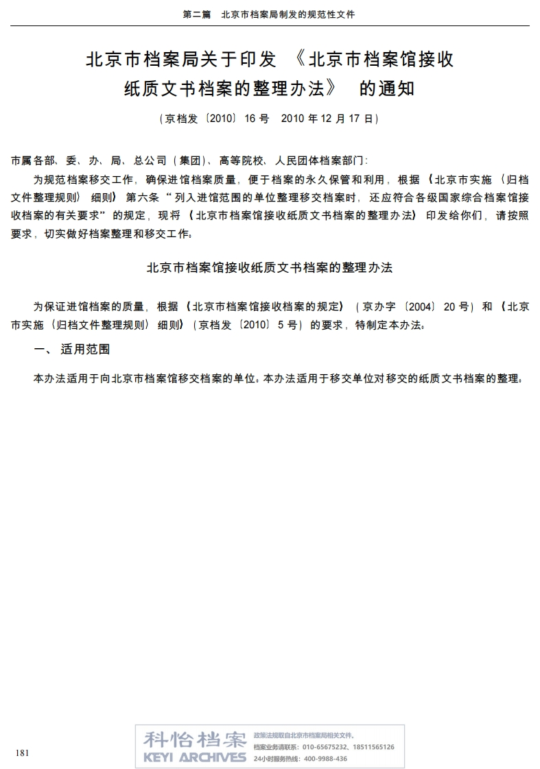 第二篇北京市档案局制发的规范性文件北京市档案局关于印发《北京市档案馆接收纸质文书档案的整理办法》的通知(京档发(2010)16号2010年12月17日)】市属各部、委、办、局、总公司(集团)、高等院校、人民团体档案部门:为规范档案移交工作,确保进馆档案质量,便于档案的永久保管和利用,根据《北京市实施〈归档文件整理规则〉细则》第六条“列入进馆范围的单位整理移交档案时,还应符合各级国家综合档案馆接收档案的有关要求”的规定,现捋《北京市档案馆接收纸质文书档案的整理办法)印发给你们,请按照要求,切实做好档案整理和移交工作。北京市档案馆接收纸质文书档案的整理办法为保证进馆档案的质量,根据(北京市档案馆接收档案的规定)(京办字〔2004)20号)和《北京市实施(归档文件整理规则)细则)(京档发〔2010)5号)的要求,特制定本办法:一、适用范围本办法适用于向北京市档案馆移交档案的单位:本办法适用于移交单位对移交的纸质文书档案的整理:科怡档案改策法规取自北京市档案局相关文件档案业务请联系:010-65675232、18511565126181KEYI AR▣HVES24小时服务热线:400-9988-436