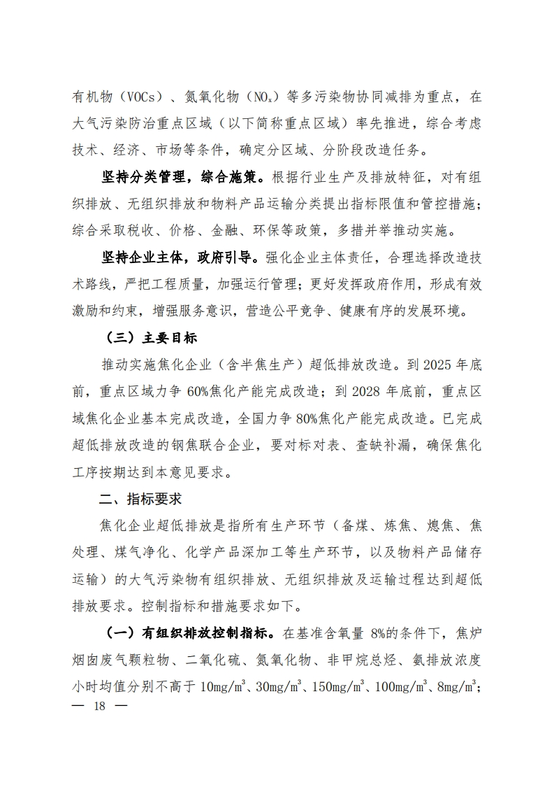 关于推进实施焦化行业超低排放的意见推进实施焦化行业超低排放是推动行业绿色低碳高质量发展、助力深入打好蓝天保卫战的重要举措。为贯彻落实《中共中央国务院关于深入打好污染防治攻坚战的意见》《中共中央国务院关于全面推进美丽中国建设的意见》《国务院关于印发〈空气质量持续改善行动计划〉的通知》等有关要求,加强对各地工作指导,高质量推进焦化行业超低排放改造,提出以下意见。一、总体要求(一)指导思想以习近平新时代中国特色社会主义思想为指导,深入贯彻党的二十大精神,全面落实习近平生态文明思想和全国生态环境保护大会精神,坚持精准、科学、依法治污,更多运用市场化、法治化手段,更好发挥政府作用,推进实施焦化行业超低排放,提升焦化行业全工序、全流程大气污染治理水平,推动行业绿色低碳转型升级,促进空气质量持续改善,为深入打好污染防治攻坚战提供有力支撑。(二)基本原则坚持系统提升,协同增效。统筹推进焦化行业超低排放改造和行业碳减排行动,优化调整产业、用能、运输结构,坚持源头防控、过程管控、末端治理系统提升,实现减污降碳协同增效。坚持突出重点,分步推进。以改善空气质量为核心,以挥发性-17