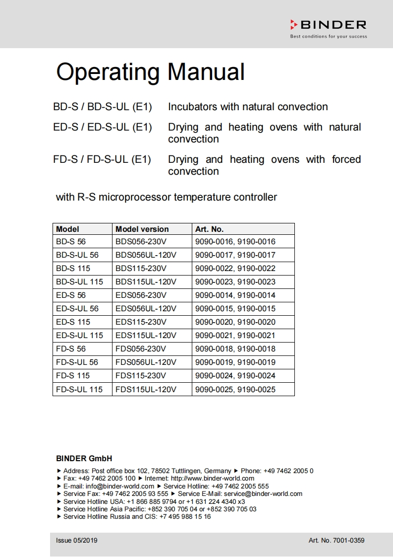 BINDERBest conditions for your successOperating ManualBD-S/BD-S-UL (E1)Incubators with natural convectionED-S/ED-S-UL (E1)Drying and heating ovens with naturalconvectionFD-S/FD-S-UL(E1)Drying and heating ovens with forcedconvectionwith R-S microprocessor temperature controllerModelModel versionArt.No.BD-S 56BDS056-230V9090-0016,9190-0016BD-S-UL 56BDS056UL-120V9090-0017,9190-0017BD-S 115BDS115-230W9090-0022,9190-0022BD-S-UL 115BDS115UL-120V9090-0023,9190-0023ED-S 56EDS056-230V9090-0014,9190-0014ED-S-UL 56EDS056UL-120V9090-0015,9190-0015ED-S 115EDS115-230V9090-0020,9190-0020ED-S-UL 115EDS115UL-120V9090-0021,9190-0021FD-S 56FDS056-230V9090-0018,9190-0018FD-S-UL 56FDS056UL-120V9090-0019,9190-0019FD-S 115FDS115-230V9090-0024,9190-0024FD-S-UL 115FDS115UL-120V9090-0025,9190-0025BINDER GmbHAddress:Post office box 102,78502 Tuttlingen,Germany Phone:+49 7462 2005 0Fax:+49 7462 2005 100 Intemnet:http://www.binder-world.comE-mail:info@binder-world.com Service Hotline:+49 7462 2005 555Service Fax:+49 7462 2005 93 555 Service E-Mail:service@binder-world.comService Hotline USA:+1 866 885 9794 or +1 631 224 4340 x3Service Hotline Asia Pacific:+852 390 705 04 or +852 390 705 03Service Hotline Russia and CIS:+7 495 988 15 16Issue 05/2019Art.No.7001-0359