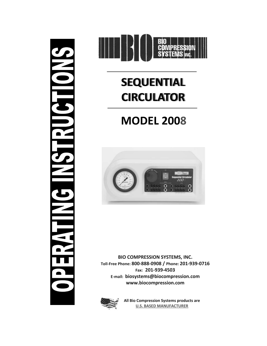 BIOCOMPRESSIONSYSTEMS INC.SEQUENTIALCIRCULATORMODEL 2008■0E数200BIO COMPRESSION SYSTEMS,INC.Tol-Free Phone:800-888-0908/Phone:201-939-0716Fax:201-939-4503E-mail:biosystems@biocompression.comwww.biocompression.comAll Bio Compression Systems products areU.S.BASED MANUFACTURER