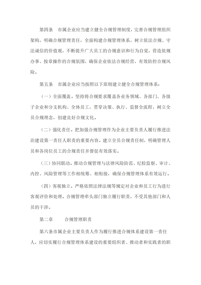 广州市市属企业合规管理指引(试行)第一章总则第一条为推动广州市市属企业全面加强合规管理,加快提升依法合规经营管理水平,着力打造法治国企,保障企业持续健康发展,根据《中华人民共和国公司法》《中华人民共和国企业国有资产法》等有关法律法规规定,参照《中央企业合规管理指引(试行)》《广东省省属企业合规管理指引(试行)》,制定本指引。第二条本指引所称市属企业是指广州市人民政府国有资产监督管理委员会(以下简称“市国资委”)直接履行出资人职责的国有及国有控股企业、国有实际控制企业。本指引所称合规,是指市属企业及其员工的经营管理行为符合法律法规、监管规定、行业准则和企业章程、规章制度以及国际条约、规则等要求。本指引所称合规风险,是指市属企业及其员工因不合规行为,发法律责任、受到相关处罚、造成经济或声誉损失以及其他负面影响的可能性。本指引所称合规管理,是指以有效防控合规风险为目的,以企业和员工经营管理行为为对象,开展包括制度制定、风险识别、合规审查、风险应对、责任追究、考核评价、合规培训等有组织、有计划的管理活动。第三条市国资委负责指导监督市属企业合规管理工作。