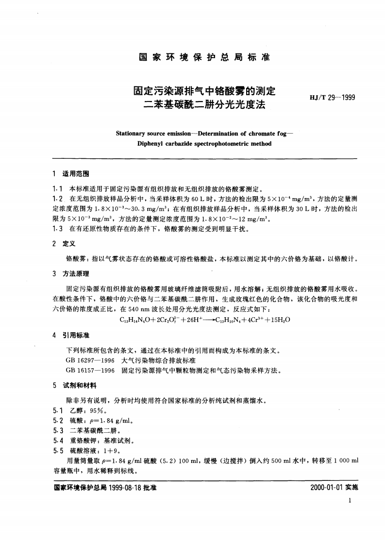 HJT29-1999固定污染物排气中铬酸雾的测定.二苯碳酰二肼分光光度法348072@abc5个月前发布关注私信0.26MB6页023HJT29-1999固定污染物排气中铬酸雾的测定.二苯碳酰二肼分光光度法此内容为付费资源,请付费后查看¥17¥22黄金会员免费钻石会员免费立即购买您当前未登录!建议登陆后购买,可保存购买订单付费资源 第1页 / 共6页 第2页 / 共6页 试读已结束,还剩4页,您可下载完整版后进行离线阅读 THE END标准规范 文本预览 HJ国家坏境保护总局标准HJ/T29-1999固定污染源排气中铬酸雾的测定二苯基碳酰二肼分光光度法Stationary source emission-Determination of chromate fog-Diphenyl carbazide spectrophotometric method199908-18发布2000-01-01实施国家环境保护总局发布 查看更多 收起部分 喜欢就支持一下吧收藏