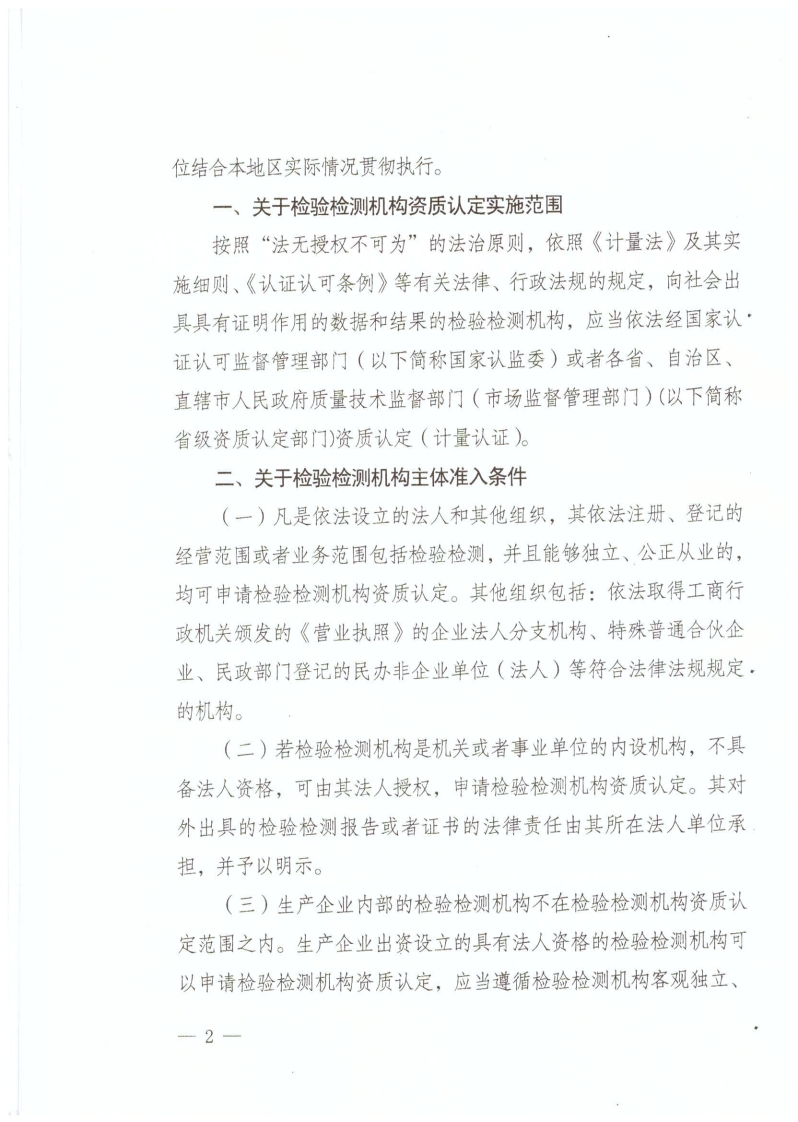 国家认证认可监督管理委员会文件国认实〔2015〕49号国家认监委关于实施《检验检测机构资质认定管理动法》的若千意见各省、自治区、直辖市质量技术监督局(市场监督管理部门),各直属检验检疫局,各国家资质认定(计量认证)行业评审组,中国合格评定国家认可中心:《检验检测机构资质认定管理办法》(质检总局令第163号,以下简称《办法》)已于2015年4月9日公布,自2015年8月1日施行。为贯彻实施该《办法》,落实国务院、国家质检总局有关深化检验检测机构资质许可改革要求,切实履行检验检测机构资质认定与监管工作:职责,进一步简政放权,营造公平竞争、有序开放的检验检测市场环境,推动检验检测高技术现代服务业做强做大、健康发展,保证检验检测机构资质认定各项改革措施顺利到位,现提出以下意见,请各单1