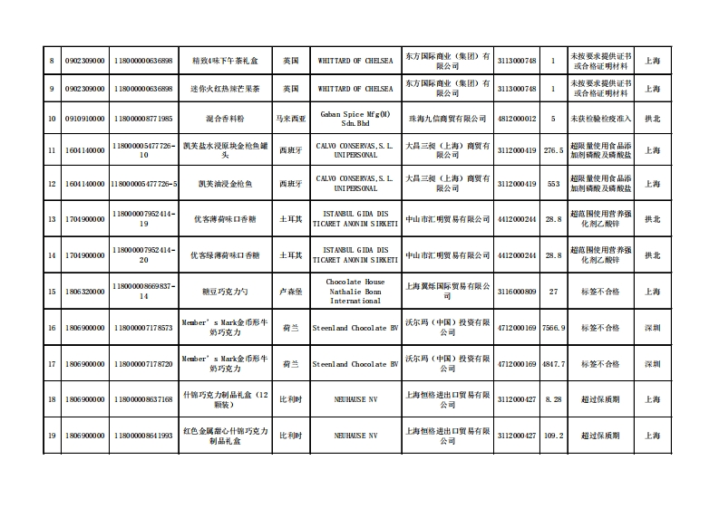 附件郑重说明:本表所列未准入境的食品在进口检验时不符合食品安全国家标准或相关法律法规要求,都已依法做退货或销毁处理。2018年12月未准入境的食品信息序压情科撞雄世变输号产品名草户地生产业业物喜进口高信喜未准入黄的进境口岸Minh Phu Hau Giang0306172900118000009078323冻凡纳对虾越南Seafood Joint Stock厦门好栈行贸导有限公司3916000877外包转标识不合格厦门Company Olinh Phu HauGiang Seafood Corp》UE+SR烈W0401200000118000008580127德瑞之星部分脱脂牛奶德国MILCHPRODUK TE绿地众选(上海)国际贸号有限公司3115001218309未按要求提供证书GBICO.NG或合格证明材料上海未按要求提供证书0902103000118000000636838芒果佛手柑茶英国WHITTARD OF CHELSEA东方国际商业(集团)有限公司3113000748或合格证明材料上海未按巫求提供证书0902109000118000000636898精致绿茶套装英国WHITTARD OF CHELSEA东方国际商业(集团)有限公司31130007431或合格证明材料上海东方国际商业(集团)有未按巫求提供证书50902109000118000000636838迷你明黄松露椰果茶英国WHITTARD OF CHELSEA限公司3113000748或合格证明材料上海东方国际商业〔集团)有未按要求提供证书0902309000118000000636898精致伯爵红茶英国WHITTARD OF CHELSEA限公司311300074810或合格证明材料上海0902303000118000000636898精致英式茶套装英国未按要求提供证书WHITTARD OF CHELSEA东方国际商业(集团)有3113000748限公司或合格证明材料上海