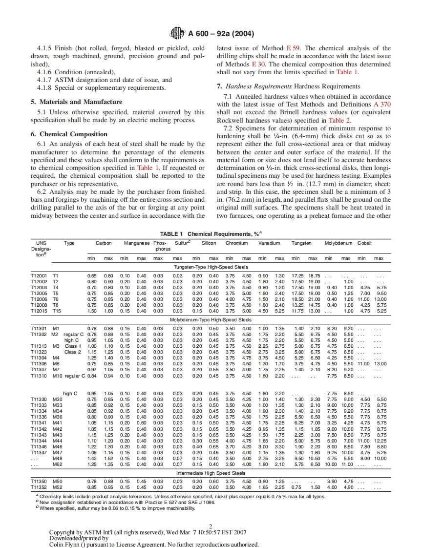 Designation:A 600-92a (Reapproved 2004)NTERNATIONALStandard Specification forTool Steel High Speed1This standard is issued under the fixed designation A 600;the number immediately following the designation indicates the year oforiginal adoption or,in the case of revision,the year of last revision.A number in parentheses indicates the year of last reapproval.Asuperscript epsilon ()indicates an editorial change since the last revision or reapproval.This standard has been approved for use by agencies of the Department of Defense.1.Scope2.2 Military Standard:1.1 This specification covers tungsten-type andMIL-STD-163 Steel Mill Products,Preparation for Ship-molybdenum-type high-speed steels available as annealed,ment and Storage3hot-rolled bars,forgings,plate,sheet,or strip,and annealed,2.3 Federal Standards:cold-finished bars or forgings used primarily in the fabricationFed.Std.No.123 Marking for Shipment (Civil Agencies)3of tools.Fed.Std.No.183 Continuous Identification Marking of1.2 Seven types of tungsten high-speed tool steels desig-Iron and Steel Products3nated T1,T2,etc.,seventeen types of molybdenum high-speed3.Classificationtool steels designated M1.M2,etc.,and two intermediate highspeed steels designated as M50 and M52 are covered.Selection3.1 Material in accordance with this specification is classi-will depend upon design,service conditions,and mechanicalfied by chemical composition.Types correspond to respectiveproperties.AISI designations.1.3 The term "high-speed steel"is described and its mini-3.1.1 Types T1,T2,T4,T5,T6,T8,and T15 are character-mum requirements are covered in the Annex.ized by a controlled high tungsten content along with other1.4 The values stated in inch-pound units are to be regardedalloying elements.as the standard.The values given in parentheses are provided3.1.2 Types M1,M2,M3,M4,M6,M7,M10,M30,M33,for information only.M34,M36,M41,M42,M43,M44,M46,M47,M48,andM62are characterized by a controlled high molybdenum content2.Referenced Documentsalong with other alloying elements.2.1 ASTM Standards:23.1.3 Types M2,M3,and M10 are further classified accord-A 370 Test Methods and Definitions for Mechanical Testinging to carbon range.Type M3 is further classified according toof Steel Productsvanadium range.A 388/A 388M Practice for Ultrasonic Examination of3.1.4 Types M50 and M52 are considered intermediate highHeavy Steel Forgingsspeed steels in view of their lower total alloy content than theA 561 Practice for Macroetch Testing of Tool Steel Barsstandard types.These leaner alloy grades nommally are limitedA 700 Practices for Packaging,Marking,and Loadingto less severe service conditions.Methods for Steel Products for Domestic Shipment4.Ordering InformationE 3 Methods of Preparation of Metallographic SpecimensE 30 Test Methods for Chemical Analysis of Steel.Cast4.1 Orders for material under this specification shall includeIron,Open-Hearth Iron,and Wrought Ironthe following information,as required to describe adequatelyE45 Prac