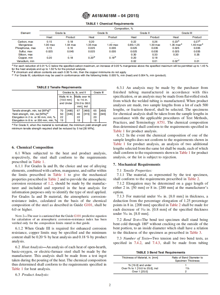 Designation:A618/A618M-04 (Reapproved 2015)NTERNATIONALStandard Specification forHot-Formed Welded and Seamless High-Strength Low-AlloyStructural TubingThis standard is issued under the fixed designation A618/A618M:the number immediately following the designation indicates the yearof original adoption or,in the case of revision,the year of last revision.A number in parentheses indicates the year of last reapproval.A superscript epsilon ()indicates an editorial change since the last revision or reapproval.This standard has been approved for use by agencies of the U.S.Department of Defense.1.Scopefor Steel Products for Shipment1.1 This specification covers grades of hot-formed weldedA751 Test Methods,Practices,and Temminology for Chemi-and seamless high-strength low-alloy square,rectangular,cal Analysis of Steel Productsround,or special shape structural tubing for welded,riveted,orG101 Guide for Estimating the Atmospheric Corrosion Re-bolted construction of bridges and buildings and for generalsistance of Low-Alloy Steelsstructural purposes.When the steel is used in weldedconstruction,the welding procedure shall be suitable for the3.Ordering Informationsteel and the intended service.3.1 Orders for material under this specification should1.2 Grade II has atmospheric corrosion resistance equiva-include the following as required to describe the materiallent to that of carbon steel with copper (0.20 minimum Cu)adequately:Grades la and Ib have atmospheric corrosion resistance sub-3.1.1 Quantity (feet,metres,or number of lengths),stantially better than that of Grade II(Note 1).When properly3.1.2 Grade (Table 1 and Table 2).exposed to the atmosphere,Grades la and Ib can be used bare3.1.3 Material (round,square,or rectangular tubing),(unpainted)for many applications.When enhanced corrosion3.1.4 Method of manufacture (seamless,buttwelded,orresistance is desired,Grade III,copper limits may be specified.hot-stretch-reduced electric-resistance welded).3.1.5 Size (outside diameter and nominal wall thickness forNorE 1-For methods of estimating the atmospheric corrosion resis-round tubing and the outside dimensions and calculated nomi-tance of low alloy steels see Guide G101 or actual data.nal wall thickness for square and rectangular tubing),1.3 The values stated in either SI units or inch-pound units3.1.6 Length (specific or random,see 8.2),are to be regarded separately as standard.Within the text,the3.1.7 End condition (see 9.2).SI units are shown in brackets.The values stated in each3.1.8 Burr removal (see 9.2),system may not be exact equivalents;therefore,each system3.1.9 Certification (see 12.1),shall be used independently of the other.Combining values3.1.10 Specification designation (A618 or A618M,includ-from the two systems may result in non-conformance with theing yeardate),standard.3.1.11 End use,and3.1.12 Special requirements.2.Referenced Documents2.1 ASTM Standards:24.ProcessA370 Test Methods and Definitions for Mechanical Testing4.1 The steel shall b