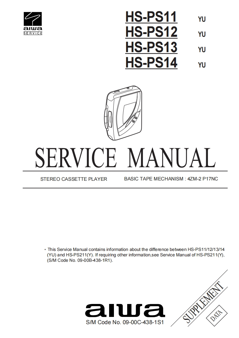 ☑HS-PS11YUaI山SERVICEHS-PS12YUHS-PS13YUHS-PS14YUSERVICE MANUALSTEREO CASSETTE PLAYERBASIC TAPE MECHANISM:4ZM-2 P17NCThis Service Manual contains information about the difference between HS-PS11/12/13/14(YU)and HS-PS211(Y).If requiring other information,see Service Manual of HS-PS211(Y),(S/M Code No.09-00B-438-1R1).auaSUPPLEMENTDATAS/M Code No.09-00C-438-1S1