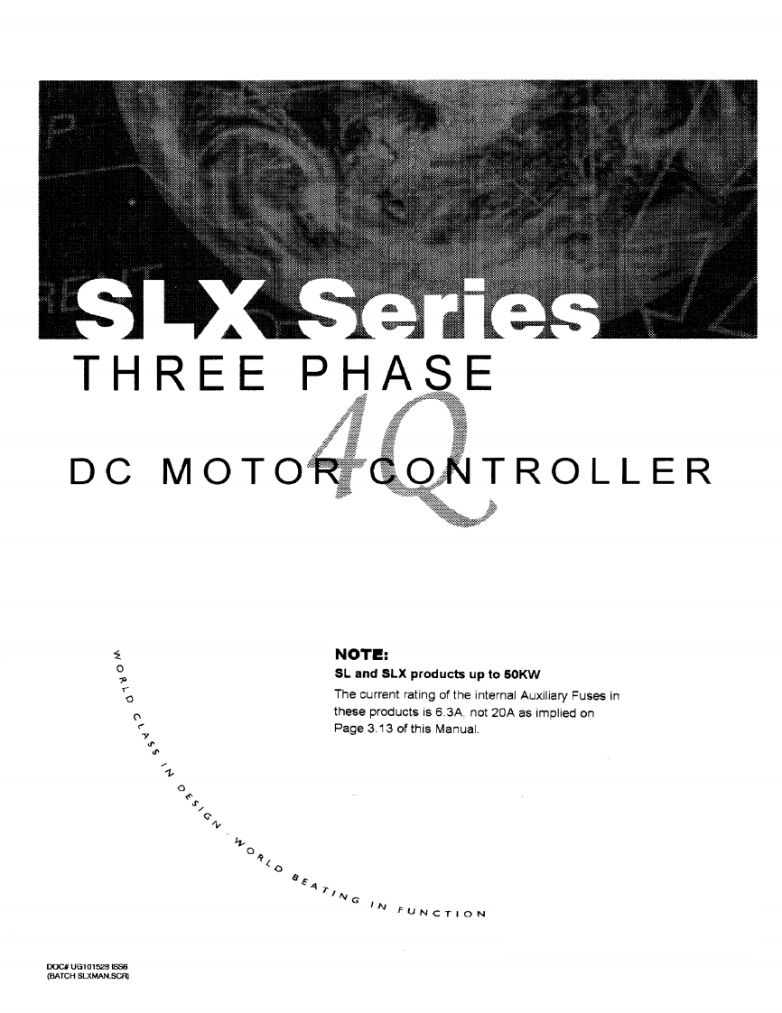SLX SeriesTHREE PHASEDCMOTOR GONTROLLERNOTE:SL and SLX products up to 50KWThe current rating of the internal Auxiliary Fuses inthese products is 6.3A,not 20A as implied onC L A SSPage 3.13 of this Manual.CN WORLD BEATING IN FUN00C#UG]101528556(BATCH SLXMAN.SCR