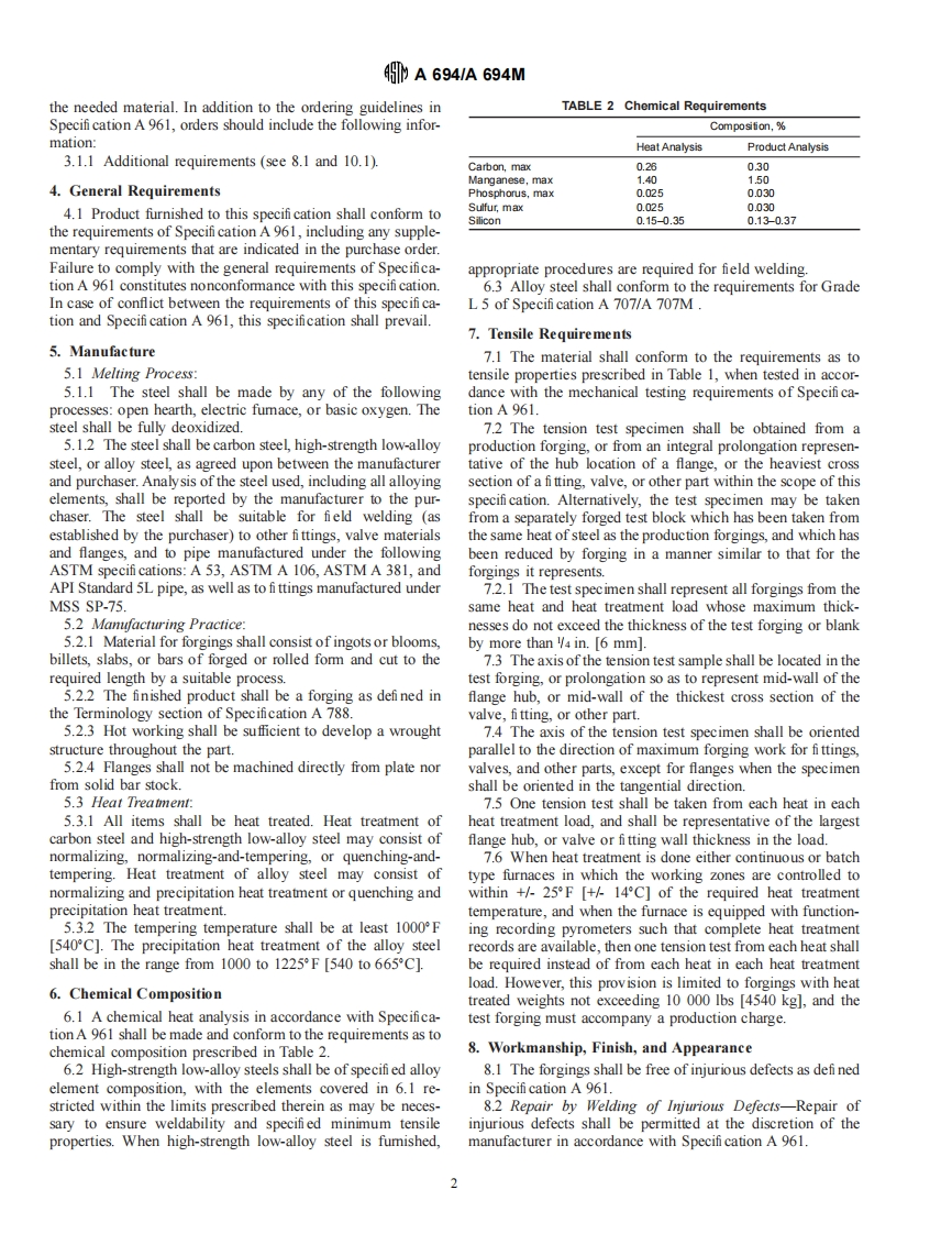 Designation:A 694/A 694M -99An American Nafional StandardStandard Specification forCarbon and Alloy Steel Forgings for Pipe Flanges,Fittings,Valves,and Parts for High-Pressure Transmission ServiceThis standard is issued under the fi xed designation A 694/A 694M;the number immediately following the designation indicates the yearoforiginal adoption or,in the case of revision,the year of last revision.A number in parentheses indicates the year of last reapproval.A superscript epsilon (e)indicates an editorial change since the last revision or reapproval.1.ScopeTABLE 1 Tensile Requirements1.1 This specifi cation covers forged or rolled steel pipeGradeYield Strength (0.2Tensile Strength,Elongation in 2flanges,forged fittings,valves,and parts suitable for use withOffset),min,ksi [MPa]min,ksi [MPa]in.or 50 mm,minhigh-strength transmission-service pipe.They are made toF4242290]60[415可20specified dimensions,or to dimensional standards,such as theF46461315]60I41520ASME and MSS specifi cations referenced in Section 1.2.F4848330]62【425201.2 Several grades of material,based on minimum yieldF5050345164[44020F5252360166I45520strength requirements,are covered,as indicated in Table 1.F56563851681470201.3 Supplementary Requirements are provided.Supplemen-F6060415]75[51520tary Requirement S 1 is provided for use when purchaserF6565450】77I53020F7070485]82I565可18approval is required for repair welding.1.4 This specifi cation is expressed in both inch-pound unitsand in SI units.However,unless the order specifies theA 788 Specification for Steel Forgings,General Require-applicable "M"specifi cation designation (SI units),the mate-ments3rial shall be fumished to inch-pound units.A 961 Specification for Common Requirements for Steel1.5 The values stated in either inch-pound units or SI unitsFlanges,Forged Fittings,Valves,and Parts for Pipingare to be regarded separately as standard.Within the text,theApplications2SI units are shown in brackets.The values stated in each2.3 ASME Standards:system are not exact equivalents;therefore,each system mustASME B 16.5 Steel Pipe Flanges and Flanged Fittingsbe used independently of the other.Combining values from theASME B 16.9 Steel Butt-Welding Fittingstwo systems may result in nonconformance with the specifi-ASME B 16.10 Face-to-Face and End-to-End Dimensionscation.of Ferrous Valves4ASME B 16.11 Forged Steel Fittings,Socket Welding and2.Referenced DocumentsThreaded2.1 In addition to those reference documents listed inASME B 16.28 Wrought Steel Butt-Welding Short RadiusSpecifi cation A 961,the following list of standards apply toElbowsthis specifi cation:ASME B 16.47 Large Diameter Steel Flanges2.2 ASTM Standards:B and PV Code Section IX,Welding QualificationsA 53/A 53M Specification for Pipe,Steel,Black and Hot-2.4 MSS Standards:5Dipped,Zinc-Coated,Welded and Seamless2MSS SP-44 Standard for Steel Pipe Line FlangesA 106 Specifi cation for Seamless Carbon Steel Pipe forMSS SP-75 Specifi cation for High-Test Welding FittingsHigh-Temp