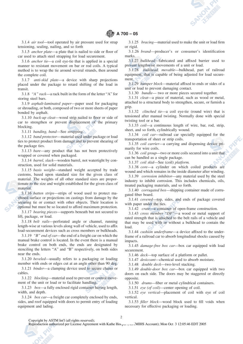 SANON PI正能国Designation:A 700-05NTERNATIONALStandard Practices forPackaging,Marking,and Loading Methods for SteelProducts for ShipmentThis standard is issued under the fixed designation A 700:the number immediately following the designation indicates the year oforiginal adoption or.in the case of revision.the year of last revision.A number in parentheses indicates the year of last reapproval.Asuperscript epsilon (e)indicates an editorial change since the last revision or reapproval.This standard has been approved for use by agencies of the Department of Defense1.Scope*1.5 This standard does not purport to address all of the1.I These practices cover the packaging,marking.andsafety concerns,if any.associated with its use.It is theloading of steel products for shipment.Assuming properresponsibility of the user of this standard to establish appro-handling in transit,the practices are intended to deliver thepriate safety and health practices and determine the applica-products to their destination in good condition.It is alsobiliry of regulatory limitations prior to use.intended that these recommendations be used as guides for2.Referenced Documentsattaining uniformity,simplicity.adequacy.and economy in theshipment of steel products.2.1 ASTM Standards:21.2 These practices cover semi-finished steel products,bars.D 245 Practice for Establishing Structural Grades and Re-bar-size shapes and sheet piling.rods,wire and wire products,lated Allowable Properties for Visually Graded LumberPIPEtubular products,plates.sheets.and strips.tin mill products,D 774 Test Method for Bursting Strength of Paperand castings.A glossary of packaging,marking,and loadingD 828 Test Methods for Tensile Breaking Strength of Paperterms is also included.and Paperboard1.3 The practices are presented in the following sequence:D 2555 Test Methods for Establishing Clear-Wood StrengthValuesSectionGeneral Provisions4D3953 Specification for Strapping.Flat Steel and SealsGeneral4.12.2 Association of American Railroads:Railcar Loading42Truck Loading4.3Rules Governing the Loading of Commodities on Open TopBarge Loading4.4CarsAir Shioment4.5Pamphlet 23-The Rules Governing the Loading of SteelPackaging Materials4.6Package Identification47Products in Closed Cars and Protection of Equipment●Weight and Count482.3 American Society of Agricultural Engineers:SANPackaging Lists or Tally4.9ASAE Standard S 229,Baling Wire for Automatic BalersLoss or Damage4.10Semifinished Steel ProductsHot-Rolled Bars and Bar-Size Shapes3.TerminologyCold-Finished Bars3.1 Definitions of Terms Specific to This Standard:Structural Shapos and Stoel Sheet Piling8Rods,Wire,and Wire Products3.1.1 The following glossary defines packaging.marking.Tubular Productsand loading terms:Plates113.1.2 AAR-Association of American Railroads.Sheets and Strip12Tin Mill Products3.1.3 "A"end of car-arbitrary definition used to describeCastingsthe end of a freight car opposite the end on which the manualbrake control is located.In the event there