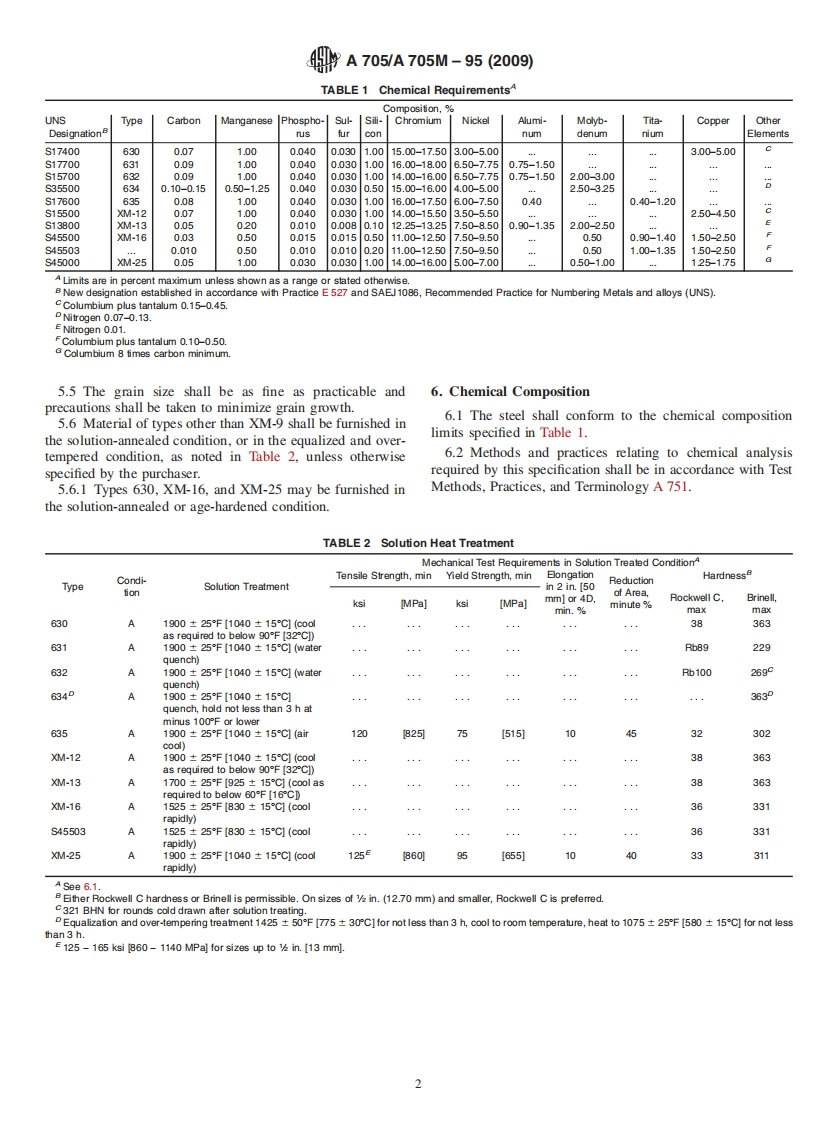 Designation:A 705/A 705M-95(Reapproved 2009)INTERNATIONALStandard Specification forAge-Hardening Stainless Steel ForgingsThis standard is issued under the fixed designation A 705/A 705M;the number immediately following the designation indicates the yearof original adoption or,in the case of revision,the year of last revision.A number in parentheses indicates the year of last reapproval.A superscript epsilon (e)indicates an editorial change since the last revision or reapproval.1.Scopespecification.Such requirements may include but are not1.1 This specification2 covers age-hardening stainless steellimited to the following:forgings for general use.3.1.1 Quantity (weight or number of pieces),1.2 The values stated in either SI units or inch-pound units3.1.2 Name of material (age-hardening stainless steel forg-are to be regarded separately as standard.The values stated inings),each system may not be exact equivalents;therefore,each3.1.3 Dimensions,including prints or sketches,system shall be used independently of the other.Combining3.1.4 Type or UNS designation (Table 1),values from the two systems may result in non-conformance3.1.5 Heat-treated condition (Section 5),with the standard.3.1.6 Transverse properties when required (7.4),1.3 Unless the order specifies an "M"designation,the3.1.7 ASTM designation and date of issue,andmaterial shall be furnished to inch-pound units.3.1.8 Special requirements (5.3,5.4).3.2 If possible,the intended end use of the item should beNoTE 1-Bar products are covered by Specification A564/A 564M.given on the purchase order,especially when the item is2.Referenced Documentsordered for a specific end use or uses.2.1 ASTM Standards:3NorE 2-A typical ordering description is as follows:5 age-hardeningA 370 Test Methods and Definitions for Mechanical Testingstainless steel forgings,Type 630,solution-annealed,ASTM Specificationof Steel ProductsA 705 dated.End use:pump blocks for oil well equipment.A 484/A 484M Specification for General Requirements for4.General RequirementsStainless Steel Bars,Billets,and ForgingsA 564/A 564M Specification for Hot-Rolled and Cold-4.1 In addition to the requirements of this specification,allFinished Age-Hardening Stainless Steel Bars and Shapesrequirements of the current edition of Specification A 484/A 751 Test Methods,Practices,and Terminology forA 484M shall apply.Failure to comply with the generalrequirements of Specification A 484/A 484M,constitutes non-Chemical Analysis of Steel ProductsE 527 Practice for Numbering Metals and Alloys in theconformance with this specification.Unified Numbering System(UNS)5.Materials and Manufacture2.2 Other Documents:4SAE J 1086 Recommended Practice for Numbering Metals5.1 Material for forgings shall consist of billets or bars,and Alloys (UNS)either forged,rolled or cast,or a section cut from an ingot.Thecuts shall be made to the required length by a suitable process3.Ordering InformationThis material may be specified to Specification A 564/A 564M.3.1 It is t