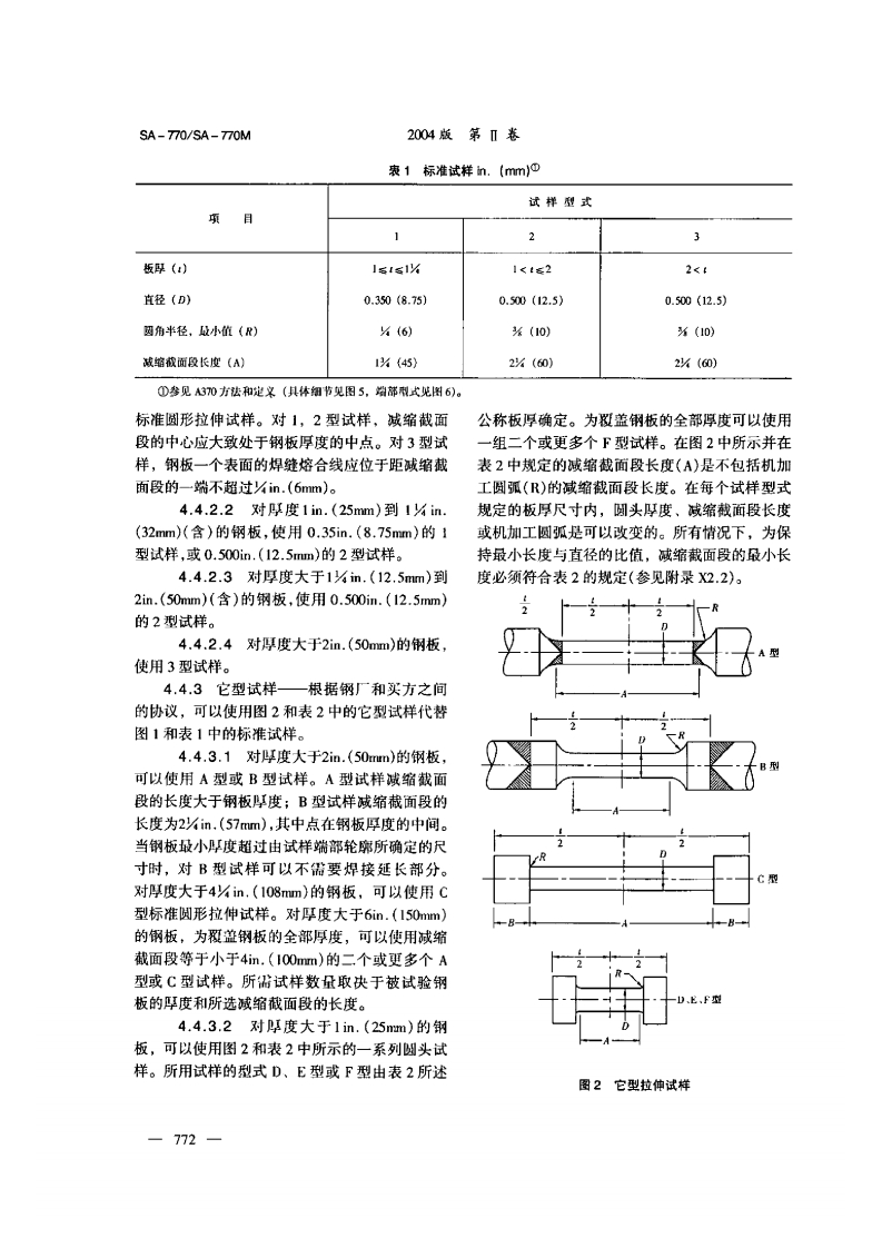 特殊用途钢板板厚方向拉伸试验SA-770/SA-770M0(与ASTM标准A770/AT70M一86完全等同)货,面以热处理(包括正火,正火加问火,以及1适用范围淬火加回火)试验验收时,应从每张轧制钢板取1.1本标准包括采用拉伸试样测定断面收缩两个试样进行试验。率的试验方法和验收标准,试样轴线垂直于厚度注:“轧制钢板”这一术语是指由板坯或直接油翩锭轧成的单等于大于1in.(25mm)的钢板轧制表而。试验的主张钢板,面不是指钢板的状态。要目的是对钢板抗层状撕裂的能力提供一种量度4.2取样部位一从按4.1所定义的每张钢板(参见附录X1)。的两端各取一个试件,试件应从板宽中央切取。1.2无论以英寸一磅单位或SI单位表示的数4.3试样的取向一试样减缩截面的纵轴应值均应视为是标准值。在本标准中,S引单位在垂直于钢板的轧制表面。括号内示出。由于两种单位制的数值并非精确相4.4试样的制备:等,故必须独立地分别采用之。如果混用两种单4.4.1焊接的延长部分一当需要时,在位制的值,将导致与本标准的不一致。被试验钢板的表面焊上延长部分。所使用的焊接1.3本标准同时以英寸一磅和SI两种单位表方法应使被试验的部分产生极小的热彬响区。手示,但除非订货单中规定采用本标准中的“M”制工电弧焊、摩擦焊、螺柱焊或电子束焊方法已证(S单位),材料将以英寸一磅单位制供货。明是合适的。4.4.2试样型式:2引用标准4.4.2.1图1和表1所示为三种型式的2.1ASTM标准:A370钢制品力学性能试验的标准试验方法和定义Tp3订货须知3.1如果需要,询价单和订货单应包括以下内容:3.1.1用以满足最终使用要求的补充要求(参见S1~S5)。3.1.2制造厂和采购方之间商定的特殊要求。4拉伸试验峰合线4.1试验数址:4.1.1除需作淬火加回火热处理的钢板外,对每张轧制板应取两个试样进行试验。对每张经淬火加回火的钢板应取两个试样进行试验。《046mI】试验应代表处于其最终状态的钢板。非:取决子板4,只有3型试样可能册壁·个烨接遮长部分4.1.2当钢板由钢厂以非热处理状态供图1标准图形拉伸试样一771