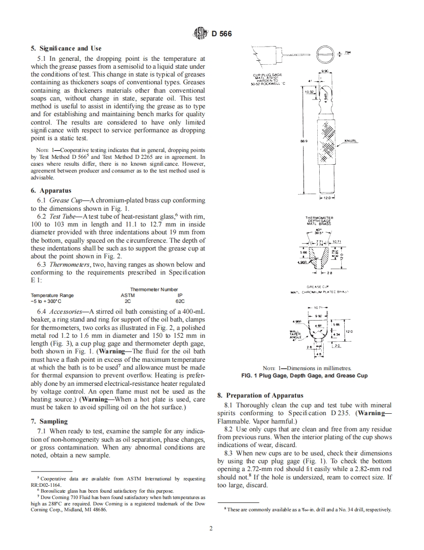Designation:D 566-02An American National StandardBritish Standard 2877INTERNATIONALIPDesignation:132/96Standard Test Method forDropping Point of Lubricating Grease1This standard is issued under the fi xed designation D 566;the number immediately following the designation indicates the year oforiginal adoption or,in the case of revision,the year of last revision.A number in parentheses indicates the year of last reapproval.Asuperscript epsilon (e)indicates an editorial change since the last revision or reapproval.This test method was adopted as a joint ASTM-IP standard in 1964.This test method has been adopted for use by government agencies to replace Method 142I of Federal Test Method Standard No.791 b.1.Scope3.1.1.1 Discussion-The dispersion of the thickner forms a1.1 This test method covers the determination of the drop-two-phase system and immobilizes the liquid lubricant byping point of lubricating grease.surface tension and other physical forces.Other ingredients are1.2 This test method is not recommended for use at bathcommonly included to impart special properties.D217temperatures above 288C.For higher temperatures Test3.1.2 thickener,nin lubricating grease,a substance com-Method D2265 should be used.posed of fi nely-divided particles dispersed in a liquid to form1.3 This standard does not purport to address all of thethe product's structuresafety concerns,if any,associated with its use.It is the3.1.2.1 Discussion-Thickeners can be fi bers (such as vari-responsibility of the user of this standard to establish appro-ous metallic soaps)or plates or spheres (such as certainpriate safety and health practices and determine the applica-non-soaps thickeners),which are insoluble or,at most,onlybility of regulatory limitations prior to use.For specifi c hazardvery slightly soluble in the liquid lubricant.The generalstatements,see 6.4 and 8.1.requirements are that the solid particles are extremely small,uniformly dispersed and capable of forming a relatively stable,2.Referenced Documentsgel-like structure with the liquid lubricant.D2172.1 ASTM Standards:3.2 Defnitions of Terms Specific to This Standard:D 217 Test Methods for Cone Penetration of Lubricating3.2.1 dropping point,na numerical value assigned to aGrease2grease composition representing the temperature at which theD 235 Specifi cation for Mineral Spirits(Petroleum Spirits)first drop of material falls from the test cup;that temperature(Hydrocarbon Dry Cleaning Solvents)3being the average of the thermometer readings of the sampleD 2265 Test Method for Dropping Point of Lubricatingand bath.Grease Over Wide Temperature Range'3.2.1.1 Discussion-In the normal and proper operation ofE 1 Specifi cation for ASTM Thermometers"this test method the temperature of the interior of the greasetest cup and the temperature of the oil bath are monitored3.Terminologysimultaneously as the bath is heated.When the first drop of3.1 Definitions:material falls from the cup,the temperature of the grease test3.1.1 lub