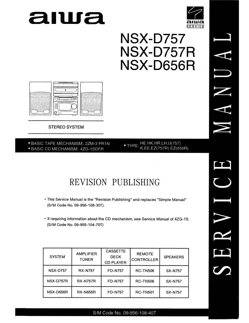auaalwaSERVICENSX-D757NSX-D757RNSX-D656RTYONYWSTEREO SYSTEMBASIC TAPE MECHANISM:2ZM-3 PR1NHE.HK.HR.LH.U(757)BASIC CD MECHANISM:4ZG-1SDFR.TYPE.K.EE.EZ(757R)EZ(656R)REVISION PUBLISHINGThis Service Manual is the "Revision Publishing"and replaces "Simple Manual"(S/M Code No.09-956-108-30T).If requiring information about the CD mechanism,see Service Manual of 4ZG-1S.(S/M Code No.09-955-104-70TAMPLIFIERCASSETTEREMOTEaoIAdISSYSTEMDECKSPEAKERSTUNERCONTROLLERCD PLAYERNSX-D757RX-N757FD-N757RC-TN506SX-N757NSX-D757RRX-N757RFD-N757RC-TN506SX-N757NSX-D656RRX-N656RFD-N757RC-TN501SX-N757S/Code No.09-956-108-40T