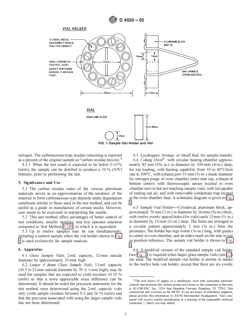 Designation:D 4530-03An American Nafional StandardNTERNATIONALStandard Test Method forDetermination of Carbon Residue (Micro Method)1This standard is issued under the fixed designation D4530;the number immediately following the designation indicates the year oforiginal adoption or,in the case of revision,the year of last revision.A number in parentheses indicates the year of last reapproval.Asuperscript epsilon (e)indicates an editorial change since the last revision or reapproval.This standard has been approved for use by agencies of the Department of Defense.1.Scope*priate safety practices and to determine the applicability of1.1 This test method covers the determination of the amountregulatory limitations prior to use.For specifc warningof carbon residue (see Note 1)formed after evaporation andstatements,see 8.2.3 and 8.4pyrolysis of petroleum materials under certain conditions and2.Referenced Documentsis intended to provide some indication of the relative cokeforming tendency of such materials2.1 ASTM Standards:1.2 The test results are equivalent to the Conradson CarbonD 189 Test Method for Conradson Carbon Residue ofResidue test (see Test Method D 189Petroleum Products'D 482 Test Method for Ash from Petroleum Products3NorE 1-This procedure is a modification of the original method andD 4046 Test Method for Alkyl Nitrate in Diesel Fuels byapparatus for carbon residue of petroleum materials,where it has beenSpectrophotometry"demonstrated that thermogravimetry is another applicable technique.2However,it is the responsibility of the operator to establish operatingD 4057 Practice for Manual Sampling of Petroleum andconditions to obtain equivalent results when using thermogravimetry.Petroleum Products41.3 This test method is applicable to petroleum products thatD 4177 Practice for Automatic Sampling of Petroleum andpartially decompose on distillation at atmospheric pressure andPetroleum Productswas tested for carbon residue values of 0.10 to 30%(m/m).E 1 Specifi cation for ASTM Thermometers5Samples expected to be below 0.10 weight %(m/m)residueE 133 Specifi cation for Distillation Equipment22 IP Standard:should be distilled to remove 90%(V/V)of the flask charge(see Section9).The 10%bottoms remaining is then tested forSpecif cation for IP Standard Thermometers 7carbon residue by this test method.3.Terminology1.4 Ash-forming constituents,as defi ned by Test Method3.1 Defnitions:D 482 or non-volatile additives present in the sample will addto the carbon residue value and be included as part of the total3.1.1 carbon residue,nin petroleum products,the partremaining after a sample has been subjected to thermalcarbon residue value reported.decomposition.1.5 Also in diesel fuel,the presence of alkyl nitrates,such as3.1.1.1 Discussion-The amount of residue is dependent onamyl nitrate,hexyl nitrate,or octyl nitrate,causes a highercarbon residue value than observed in untreated fuel,whichthe test conditions of evaporation and pyrolysis.The term maybe misleadi