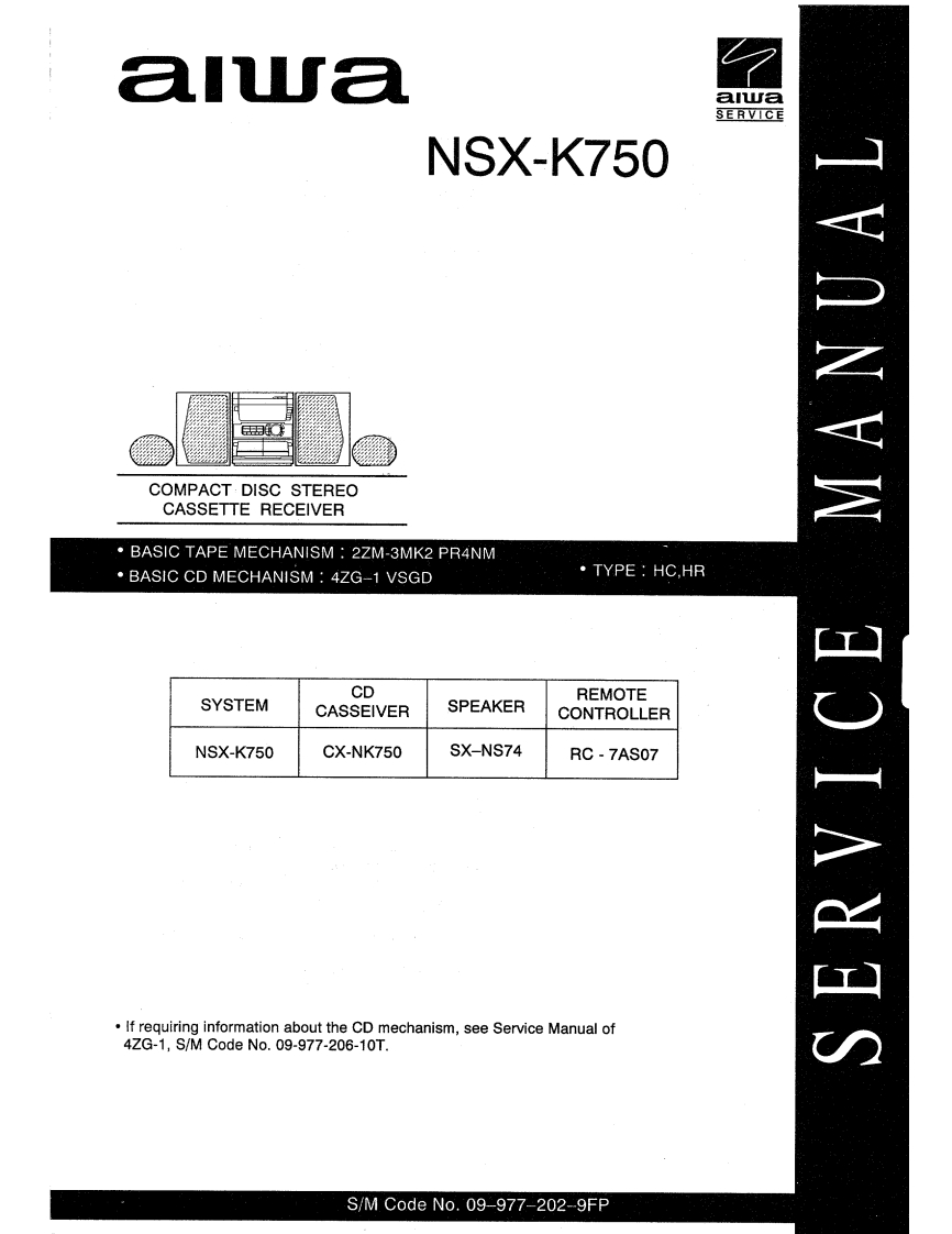 aluaalwaSERVICENSX-K750用VANVWCOMPACT·.DISC STEREOCASSETTE RECEIVERBASIC TAPE MECHANISM 2ZM-3MK2 PR4NMBASIC CD MECHANISM 4ZG-1 VSGD·TYPE:HC,HRCDSYSTEMREMOTECASSEIVERSPEAKERCONTROLLERNSX-K750CX-NK750SX-NS74RC-7AS07HOIANaSIf requiring information about the CD mechanism,see Service Manual of4ZG-1,S/M Code No.09-977-206-10T.S/M Code No.09-977-202-9FP