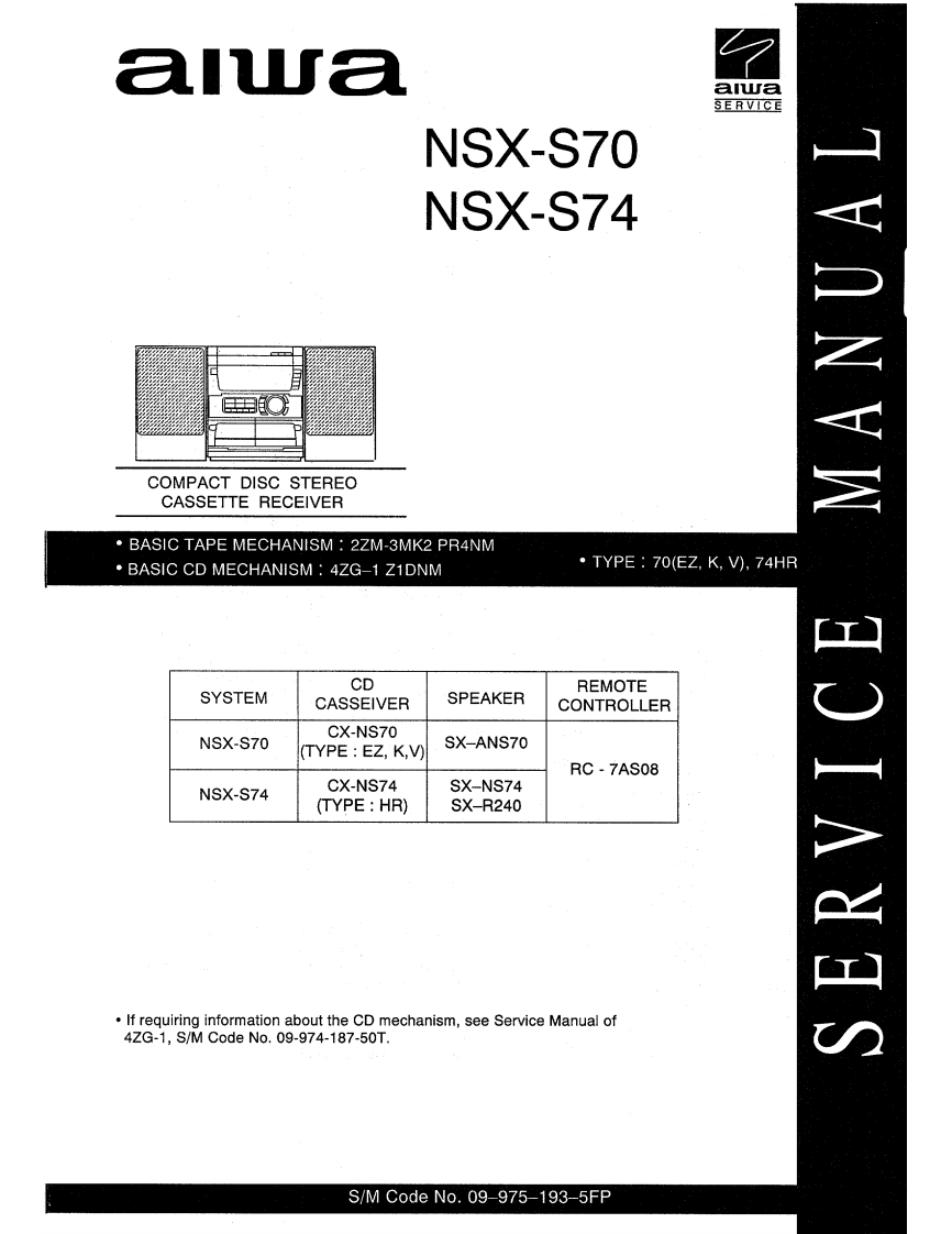 aluaaiwaSERVICENSX-S70NSX-S74TVONVNCOMPACT DISC STEREOCASSETTE RECEIVERBASIC TAPE MECHANISM 2ZM-3MK2 PR4NMBASIC CD MECHANISM 4ZG-1 Z1DNMTYPE 70(EZ,K,V),74HRCDREMOTESYSTEMCASSEIVERSPEAKERCONTROLLERNSX-S70CX-NS70(TYPE EZ,K,V)SX-ANS70RC-7AS08NSX-S74CX-NS74SX-NS74(TYPE:HR)SX-R240HOIANdSIf requiring information about the CD mechanism,see Service Manual of4ZG-1,S/M Code No..09-974-187-50T.S/M Code No.09-975-193-5FP