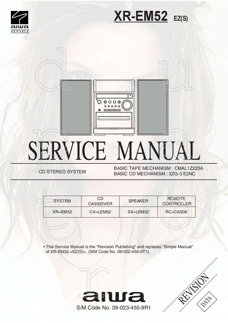 XR-EM52EZ(S)aiwaSERVICE0⊙00⊙000008SERVICE MANUALBASIC TAPE MECHANISM:CMAL1Z223ACD STEREO SYSTEMBASIC CD MECHANISM:3ZG-3 E2NCSYSTEMCDSPEAKERREMOTECASSEIVERCONTROLLERXR-EM52CX-LEM52SX-LEM52RC-CAS06·This Service Manual is the“Revision Publishing”and replaces“"Simple Manual"of XR-EM52 ,(S/M Code No.09-022-455-9T1).aluaREVISIONS/M Code No.09-023-455-9R1DATA