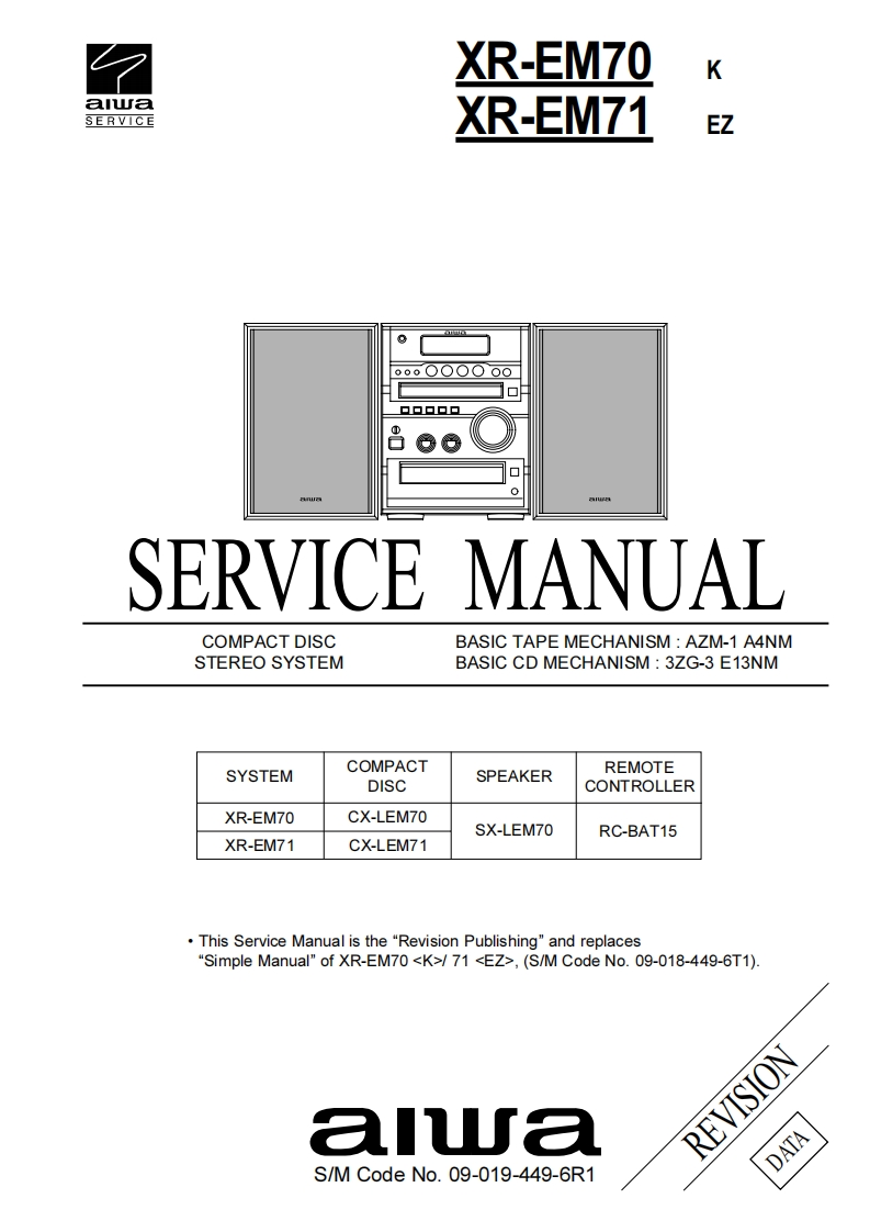 ☑XR-EM70KaI山SERVICEXR-EM71EZ000OOOO00▣口口口口口SERVICE MANUALCOMPACT DISCBASIC TAPE MECHANISM:AZM-1 A4NMSTEREO SYSTEMBASIC CD MECHANISM:3ZG-3 E13NMSYSTEMCOMPACTREMOTEDISCSPEAKERCONTROLLERXR-EM70CX-LEM70SX-LEM70RC-BAT15XR-EM71CX-LEM71This Service Manual is the "Revision Publishing"and replaces"Simple Manual"of XR-EM70 /71 ,(S/M Code No.09-018-449-6T1).a uaREVISIONDATAS/M Code No.09-019-449-6R1