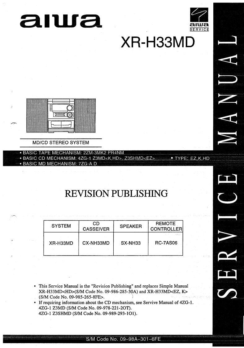 auaaiwaSERVICEXR-H33MDTVONVWMD/CD STEREO SYSTEMBASIC TAPE MECHANISM:2ZM-3MK2 PR4NM·BASIC CD MECHANISM:4ZG1Z3MDZ3 SHMD(S/M Code No.09-986-285-30A)and XR-H33MD(S/M Code No.09-985-265-8FE>.If requiring information about the CD mechanism,see Servive Manual of 4ZG-1.4ZG-1Z3MD(S/M Code No..09-978-221-20T).4ZG-1 Z3SHMD (S/M Code No.09-989-293-101).S/M Code No.09-98A-301-6FE