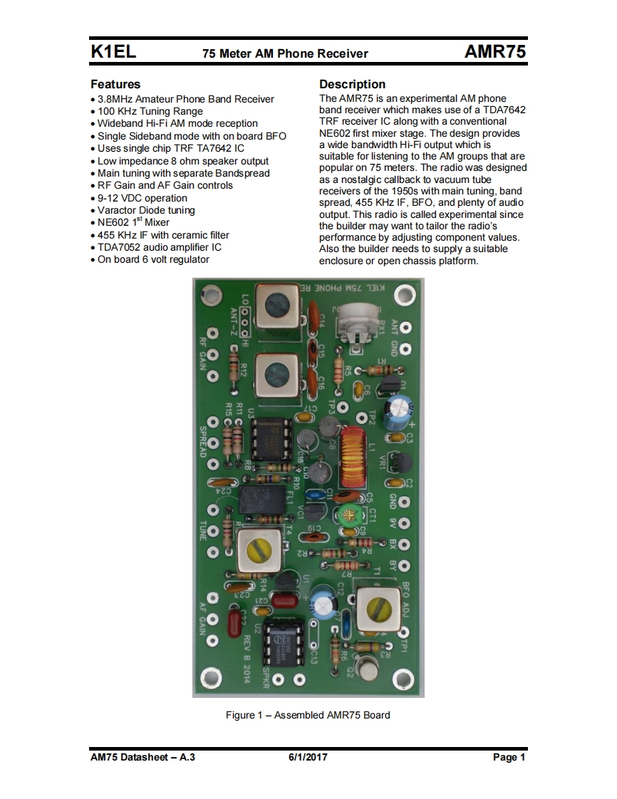 K1EL75 Meter AM Phone ReceiverAMR75FeaturesDescription.3.8MHz Amateur Phone Band ReceiverThe AMR75 is an experimental AM phone。100 KHz Tuning Rangeband receiver which makes use of a TDA7642Wideband Hi-Fi AM mode receptionTRF receiver IC along with a conventionalSingle Sideband mode with on board BFONE602 first mixer stage.The design providesUses single chip TRF TA7642 ICa wide bandwidth Hi-Fi output which isLow impedance 8 ohm speaker outputsuitable for listening to the AM groups that areMain tuning with separate Bandspreadpopular on 75 meters.The radio was designed.RF Gain and AF Gain controlsas a nostalgic callback to vacuum tube.9-12 VDC operationreceivers of the 1950s with main tuning,bandspread,455 KHz IF,BFO,and plenty of audio.Varactor Diode tuning◆NE6021 st Mixeroutput.This radio is called experimental sincethe builder may want to tailor the radio's.455 KHz IF with ceramic filterperformance by adjusting component values..TDA7052 audio amplifier ICAlso the builder needs to supply a suitableOn board 6 volt regulatorenclosure or open chassis platform.3NOHd WSL 73LXooOANT-Z CLO OOOHIR12Figure 1-Assembled AMR75 BoardAM75 Datasheet-A.36/112017Page 1