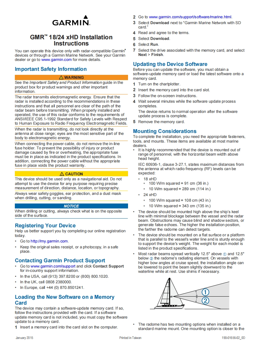 GARMIN.2 Go to www.garmin.com/support/software/marine.html.3 Select Download next to "Garmin Marine Network with SDcard."4 Read and agree to the terms.GMR18/24 xHD Installation5 Select Download.Instructions6 Select Run.You can operate this device only with radar-compatible Garmin"7 Select the drive associated with the memory card,and selectdevices or through a Garmin Marine Network.See your GarminNext Finish.dealer or go to www.garmin.com for more details.Updating the Device SoftwareImportant Safety InformationBefore you can update the software,you must obtain asoftware-update memory card or load the latest software onto aA WARNINGmemory card.See the Important Safety and Product Information guide in the1 Turn on the chartplotter.product box for product warnings and other importantinformation.2 Insert the memory card into the card slot.The radar transmits electromagnetic energy.Ensure that the3 Follow the on-screen instructions.radar is installed according to the recommendations in these4 Wait several minutes while the software update processinstructions and that all personnel are clear of the path of thecompletes.radar beam before transmitting.When properly installed andThe device returns to normal operation after the softwareoperated,the use of this radar conforms to the requirements ofupdate process is complete.ANSI/EEE C95.1-1992 Standard for Safety Levels with Respectto Human Exposure to Radio Frequency Electromagnetic Fields5 Remove the memory card.When the radar is transmitting.do not look directly at theantenna at close range;eyes are the most sensitive part of theMounting Considerationsbody to electromagnetic energyTo complete the installation,you need the appropriate fastenerstools,and mounts.These items are available at most marineWhen connecting the power cable,do not remove the in-linedealers.fuse holder.To prevent the possibility of injury or productdamage caused by fire or overheating,the appropriate fuseIt is highly recommended that the device is mounted out ofmust be in place as indicated in the product specifications.Inrange of personnel,with the horizontal beam width aboveaddition,connecting the power cable without the appropriatehead height.fuse in place voids the product warranty.IEC 60936-1.clause 3-27.1.states maximum distances fromthe antenna at which radio frequency (RF)levels can be△CAUTIONexpected:This device should be used only as a navigational aid.Do not18 xHDattempt to use the device for any purpose requiring precise100 W/m squared 91 cm (36 in.)measurement of direction,distance,location,or topography.10 W/m squared 289 cm (114 in.)Always wear safety goggles,ear protection,and a dust mask24 xHDwhen drilling,cutting,or sanding.100 W/m squared 108 cm(43 in.)NOTICE10 W/m squared 343 cm (135 in.)When drilling or cutting,always check what is on the oppositeThe device should be mounted high above the ship's keelside of the surface.line with minimal blockage between the vessel and the radarbeam.Obstructions may cause blind