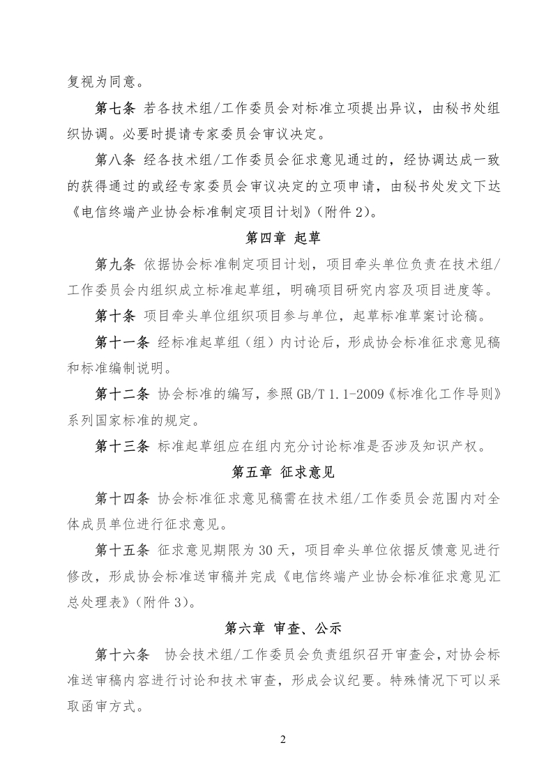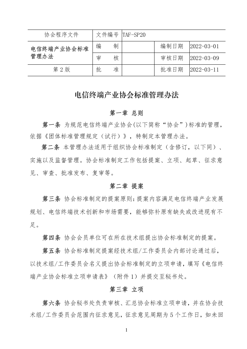 协会程序文件文件编号TAF-SP20电信终端产业协会标准编制编制日期2022-03-01管理办法审核审核日期2022-03-09第2版批准批准日期2022-03-11电信终端产业协会标准管理办法第一章总则第一条为规范电信终端产业协会(以下简称“协会”)标准的管理,依据《团体标准管理规定(试行)》,特制定本管理办法。第二条本管理办法适用于组织协会标准制定(含修订,以下同)、实施以及监督管理。协会标准制定工作包括提案、立项、起草、征求意见、审查、批准发布、复审等。第二章提案第三条协会标准制定的提案原则:提案内容满足电信终端产业发展规划、电信终端技术创新和市场需要,能够弥补原有缺失或改进现有不足。第四条协会会员单位可在所在技术组提出协会标准制定的提案。第五条协会标准制定提案经技术组/工作委员会内部讨论通过后,以技术组/工作委员会名义提出协会标准制定的立项申请,填写《电信终端产业协会标准立项申请表》(附件1)并提交至秘书处。第三章立项第六条协会秘书处负责审核、汇总协会标准立项申请,并在协会技术组/工作委员会范围内征求意见,征求意见周期为5个工作日,如未回