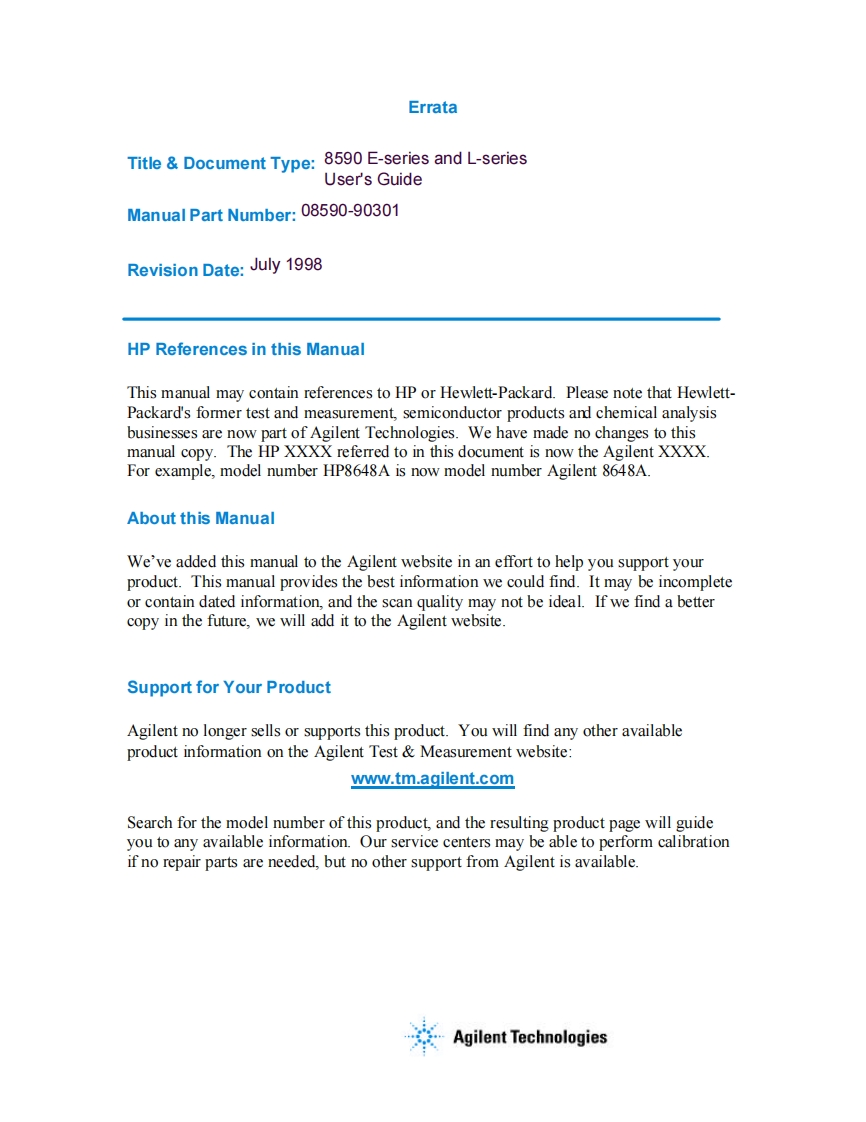 ErrataTitle&Document Type:8590 E-series and L-seriesUser's GuideManual Part Number:08590-90301Revision Date:July 1998HP References in this ManualThis manual may contain references to HP or Hewlett-Packard.Please note that Hewlett-Packard's former test and measurement,semiconductor products and chemical analysisbusinesses are now part of Agilent Technologies.We have made no changes to thismanual copy.The HP XXXX referred to in this document is now the Agilent XXXXFor example,model number HP8648A is now model number Agilent 8648A.About this ManualWe've added this manual to the Agilent website in an effort to help you support yourproduct.This manual provides the best information we could find.It may be incompleteor contain dated information,and the scan quality may not be ideal.If we find a bettercopy in the future,we will add it to the Agilent website.Support for Your ProductAgilent no longer sells or supports this product.You will find any other availableproduct information on the Agilent Test Measurement website:www.tm.agilent.comSearch for the model number of this product,and the resulting product page will guideyou to any available information.Our service centers may be able to perform calibrationif no repair parts are needed,but no other support from Agilent is available.Agilent Technologies