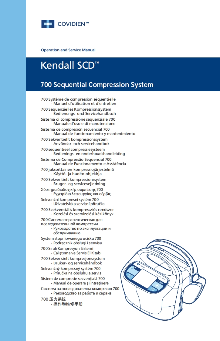 中COVIDIEN TMOperation and Service ManualKendall SCDTM700 Sequential Compression System700 Systeme de compression sequentielle-Manuel d'utilisation et d'entretien700 Sequenzielles KompressionssystemBedienungs-und ServicehandbuchSistema di compressione sequenziale 700-Manuale d'uso e di manutenzioneSistema de compresion secuencial 700Manual de funcionamiento y mantenimiento700 Sekventiellt kompressionssystem-Anvandar-och servicehandbok700 sequentieel compressiesysteem-Bedienings-en onderhoudshandleidingSistema de Compressao Sequencial 700-Manual de Funcionamento e Assistencia700 jaksoittainen kompressiojarjestelma-Kaytto-ja huolto-ohjekirja700 Sekventielt kompressionssystem-Bruger-og servicevejledningΣUoTmμa6ia6 OXIKnc OUμnisonc700-EyXapi6ioλErToupyiac Kal oEpβGSekvencni kompresni system 700Uzivatelska a servisni prirucka700 Szekvencialis kompresszios rendszer-Kezelesi es szervizelesi kezikonyv700 CncreMa TepaneBTnuecKa AnnocnenoBaTenbHon KoMnpeccnnPyKoBOCTBo no 3Kcnnyataunn Wo6cnyKNBaHNIOSystem stopniowanego ucisku 700Podrecznik obstugi i serwisu700 Sirali Kompresyon SistemiCalistirma ve Servis El Kitabi700 Sekvensielt kompresjonssystem-Bruker-og servicehandbokSekvencny kompresny system 700-Prirucka na obsluhu a servisSistem de compresie secventiala 700Manual de operare si intretinereCncTeMa 3a nocnenoBaTenHa KoMnpecna 700-PbKOBOCTBO 3a pa6oTa M cepBN3700压力系统·操作和维修手册