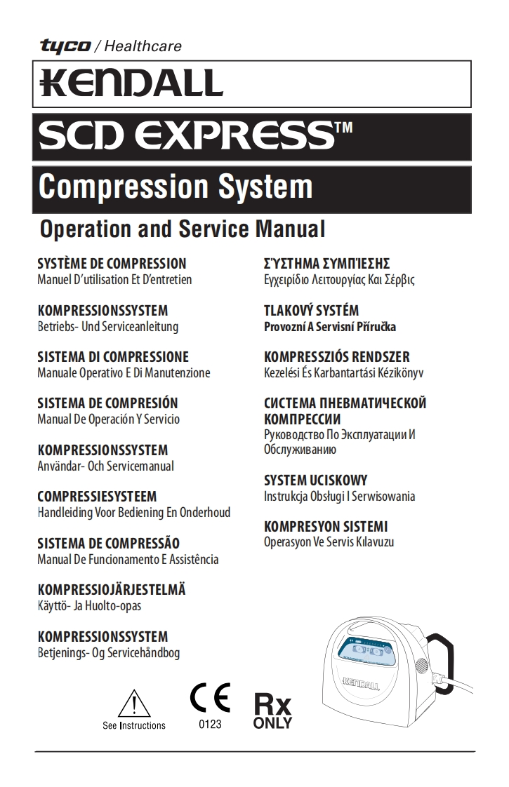 tyCo/HealthcareKEnDALLSCD EXPR∈SSMCompression SystemOperation and Service ManualSYSTEME DE COMPRESSIONE'YETHMA EYMNIEEHEManuel D'utilisation Et D'entretienEyXapiδ1 o AaToupyiac Ka∑EpβIcKOMPRESSIONSSYSTEMTLAKOVY SYSTEMBetriebs-Und ServiceanleitungProvozni A Servisni PriruckaSISTEMA DI COMPRESSIONEKOMPRESSZIOS RENDSZERManuale Operativo E Di ManutenzioneKezelesi Es Karbantartasi KezikonyvSISTEMA DE COMPRESIONCNCTEMA NHEBMATNYECKONManual De Operacion Y ServicioKOMNPECCNNPyKoBoACTBo no 3Kcnnyarayun MKOMPRESSIONSSYSTEM06cy>KnBaHnHOAnvandar-Och ServicemanualSYSTEM UCISKOWYCOMPRESSIESYSTEEMInstrukcja Obstugi I SerwisowaniaHandleiding Voor Bediening En OnderhoudKOMPRESYON SISTEMISISTEMA DE COMPRESSAOOperasyon Ve Servis KilavuzuManual De Funcionamento E AssistenciaKOMPRESSIOJARJESTELMAKaytto-Ja Huolto-opasKOMPRESSIONSSYSTEMBetjenings-Og Servicehandbog0000KenDALLSee Instructions0123