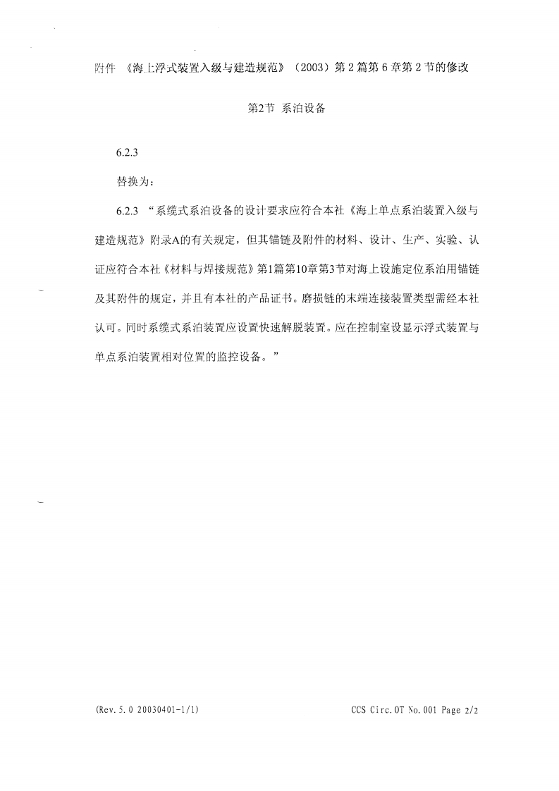 Form:RWPRR401-BCCs通函Circular中国船级社海工技术中心(2009年)通函第001号总第001号2009年7月9日(共2页)发:本社海工验船师,有关船厂,设计单位,业主关于修订《海上浮式装置入级与建造规范》(2003)第2篇第6章第2节中系泊设备内容的通知国际船级社协会(IACS)通过了“近海系泊锚链”的技术决议(参见IACSW22,Vr.4)。根据该决议我社修订了本社《海上浮式装置入级与建造规范》(2003)第2篇第6章第2节关于系泊设备的相关内容(见附件)。现将《海上浮式装置入级与建造规范》(2003)第2篇第6章第2节的修改内容以通函形式下发。生效时间为2009年9月1日。请我社审图、检验单位在相关工作中予以执行。【注:本通函在本社网站(www.Ccs.org.Cn)上发布,并由各分社转发所辖区减内的棺关韬厂、设计单位、业主】附件:《海上浮式装置入级与建造规范》(2003)第2篇第6章第2节的修改(Rev.5.020030401-1/1)CCS Circ.OT No.001 Page 1/2