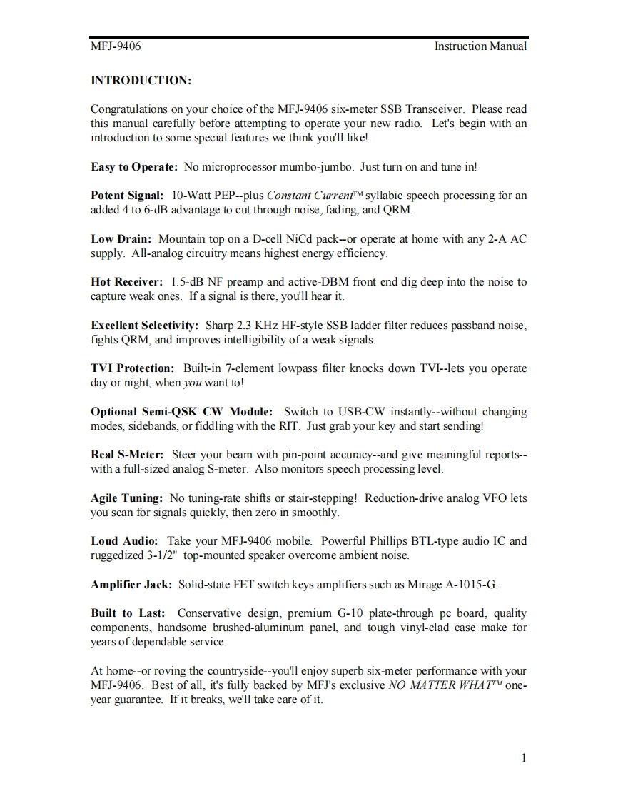 MFJ-9406Instruction ManualINTRODUCTION:Congratulations on your choice of the MFJ-9406 six-meter SSB Transceiver.Please readthis manual carefully before attempting to operate your new radio.Let's begin with anintroduction to some special features we think you'll like!Easy to Operate:No microprocessor mumbo-jumbo.Just turn on and tune in!Potent Signal:10-Watt PEP--plus Constant CurrenfTM syllabic speech processing for anadded 4 to 6-dB advantage to cut through noise,fading,and QRM.Low Drain:Mountain top on a D-cell NiCd pack-or operate at home with any 2-A ACsupply.All-analog circuitry means highest energy efficiency.Hot Receiver:1.5-dB NF preamp and active-DBM front end dig deep into the noise tocapture weak ones.If a signal is there,you'll hear it.Excellent Selectivity:Sharp 2.3 KHz HF-style SSB ladder filter reduces passband noise,fights QRM,and improves intelligibility of a weak signals.TVI Protection:Built-in 7-element lowpass filter knocks down TVI--lets you operateday or night,when you want to!Optional Semi-QSK CW Module:Switch to USB-CW instantly--without changingmodes,sidebands,or fiddling with the RIT.Just grab your key and start sending!Real S-Meter:Steer your beam with pin-point accuracy--and give meaningful reports--with a full-sized analog S-meter.Also monitors speech processing level.Agile Tuning:No tuning-rate shifts or stair-stepping!Reduction-drive analog VFO letsyou scan for signals quickly,then zero in smoothly.Loud Audio:Take your MFJ-9406 mobile.Powerful Phillips BTL-type audio IC andruggedized 3-1/2"top-mounted speaker overcome ambient noiseAmplifier Jack:Solid-state FET switch keys amplifiers such as Mirage A-1015-G.Built to Last:Conservative design,premium G-10 plate-through pc board,qualitycomponents,handsome brushed-aluminum panel,and tough vinyl-clad case make foryears of dependable service.At home--or roving the countryside--you'll enjoy superb six-meter performance with yourMFJ-9406.Best of all,it's fully backed by MFJ's exclusive NO MATTER WHATTM one-year guarantee.If it breaks,we'll take care of it.