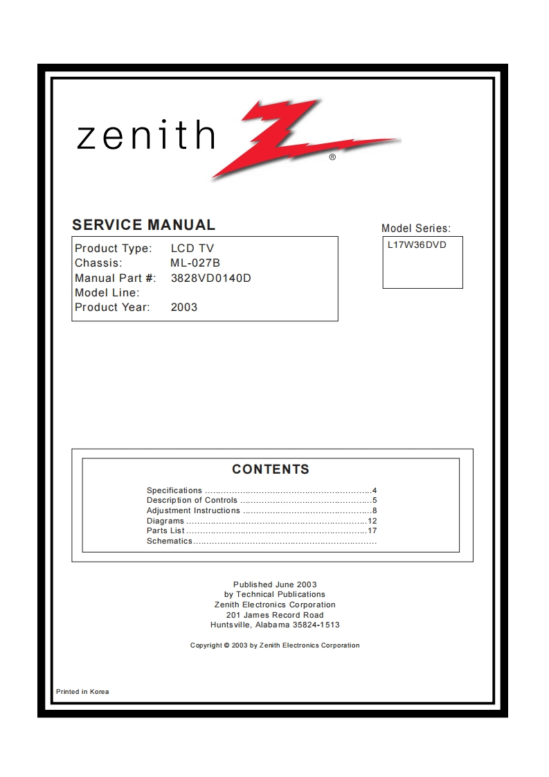 zenithSERVICE MANUALModel Series:Product Type:LCD TVL17W36DVDChassis:ML-027BManual Part #3828VD0140DModel Line:Product Year:2003CONTENTSSpecificationsDescription of Controls5Adjustment InstructionsDiagrams ...........12Parts List...........17Schematics........Published June 2003by Technical PublicationsZenith Electronics Corporation201 James Record RoadHuntsville,Alabama 35824-1513Copyright 2003 by Zenith Electronics CorporationPrinted in Korea