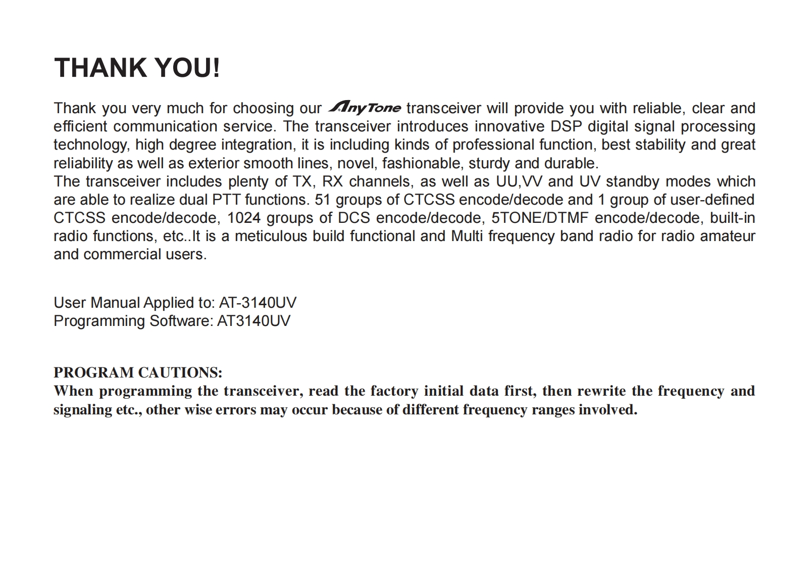 Anytone_AT-3140UV_使用说明书手册找手册网4天前发布关注私信2.39MB44页020Anytone_AT-3140UV_使用说明书手册此内容为付费资源,请付费后查看¥19¥23黄金会员免费钻石会员免费立即购买您当前未登录!建议登陆后购买,可保存购买订单付费资源 第1页 / 共44页 第2页 / 共44页 第3页 / 共44页 第4页 / 共44页 第5页 / 共44页 试读已结束,还剩39页,您可下载完整版后进行离线阅读 THE END自由通/灵通 文本预览 A1.160303Ainy ToneRWe only do best radio! 查看更多 收起部分 喜欢就支持一下吧收藏