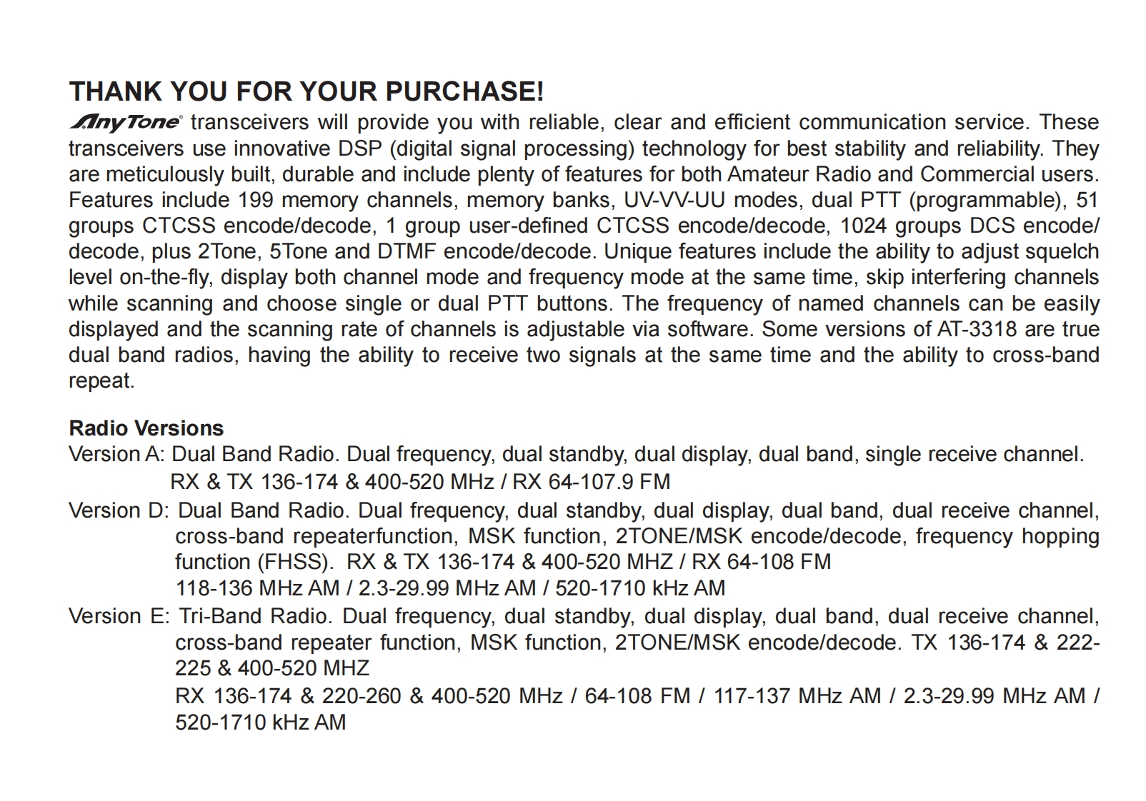Anytone_AT-3318UVA_D_E_使用说明书手册找手册网4天前发布关注私信3.42MB64页033Anytone_AT-3318UVA_D_E_使用说明书手册此内容为付费资源,请付费后查看¥19¥23黄金会员免费钻石会员免费立即购买您当前未登录!建议登陆后购买,可保存购买订单付费资源 第1页 / 共64页 第2页 / 共64页 第3页 / 共64页 第4页 / 共64页 第5页 / 共64页 试读已结束,还剩59页,您可下载完整版后进行离线阅读 THE END自由通/灵通 文本预览 A1.140813InyToneRWe only do best radio!Qixiang Electron Science Technology Co.,Ltd.www.qxdz.cn 查看更多 收起部分 喜欢就支持一下吧收藏
