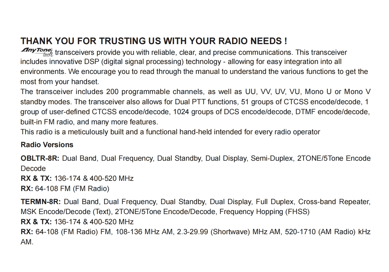 A1.160120Package and Product Designed in U.S.A.MADE IN CHINAAnyToneTech.comAny TorcCopyright 2015 by AnyTone TechAll rights reserved.No part of this publication may be reproduced,distributed,ortransmitted in any form or by any means without the permission of AnyTone Tech
