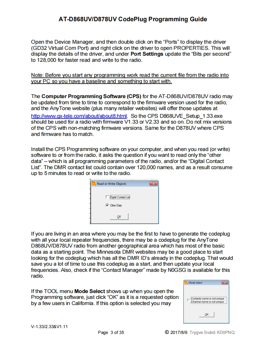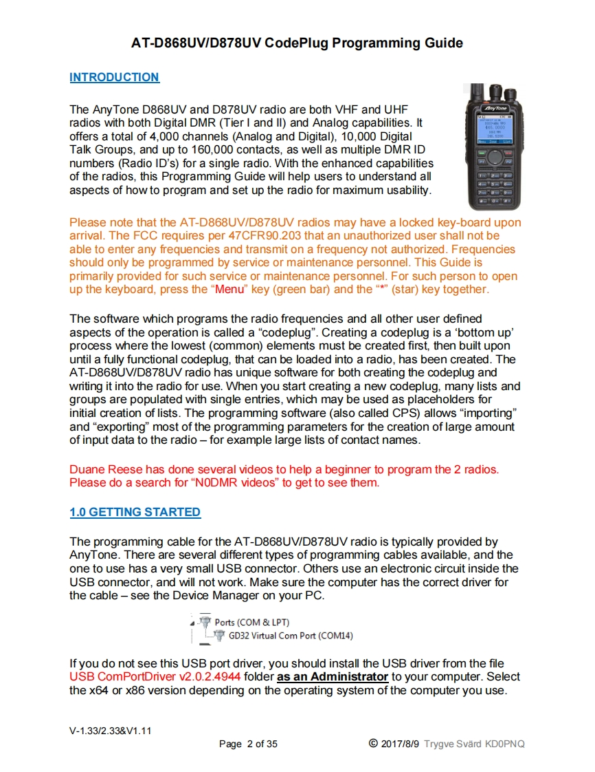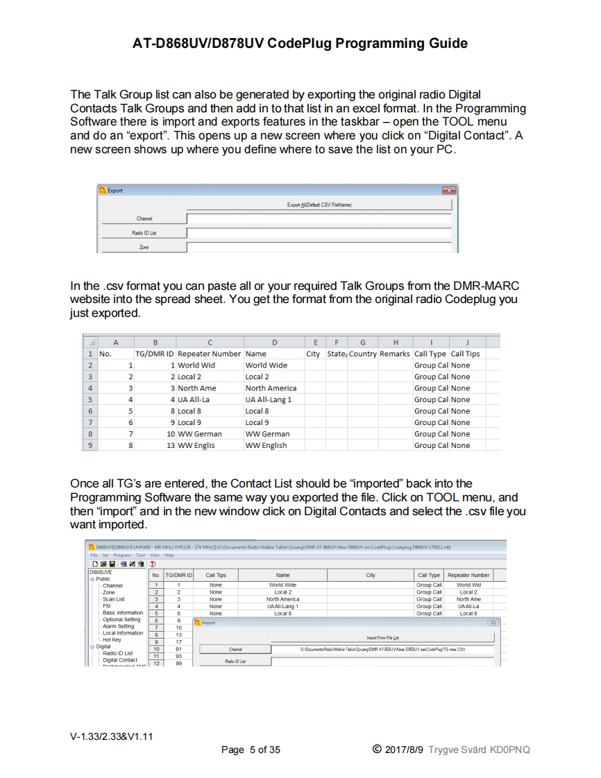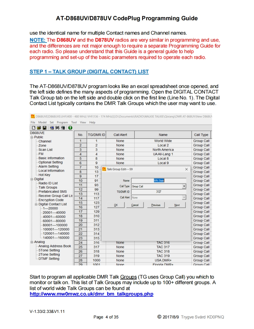 AT-D868UV/D878UV CodePlug Programming GuideKInyToneAT-D868UV/D878UVProgramming GuideIndex:1.0IntroductionPage 2Step 1Talk Group Set-upPage 4Step 2Digital Contact ListPage 6Step 3Radio ID ListPage 8Step 4Scan ListPage 8Step 5Zone ListPage 10Step 6Receive Group Call ListPage 12Step 7Channel/Frequency Set-upPage 13Step 8Optional SettingsPage 15Step 9Analog Address BookPage 21Step 10Prefabricated SMS MessagesPage 21Step 11Encryption CodePage 22Step 12Alarm SettingsPage 22Step 13Hot Key ImplementationPage 23Step 14Analog ProgrammingPage 242.0TOOL Pull-down menusPage 252.1Recording of conversationsPage 252.2Import and Export of dataPage 252.3Mode SelectionPage 25Extended Talk Group Function SettingPage 26Firmware UpdatesPage 26Start-up Screen OptionsPage 26Default Channel InformationPage 2628Export Data Conversion(Contact Mgr.)Page 2622.710Model InformationPage 26FriendList EditPage 272.11Digital APRS Information and Set-upPage 273.0Radio LCD Display explanationPage 294.0Firmware Update ProcedurePage 304.1Radio Reset ProcedurePage 314.2Radio Icon Firmware Update ProcedurePage 325.0CPS Programmer(Internet based)Page 326.0Contact Manager ProgramPage 347.0Digital Contact Wizard ProgramPage 35V-1.33/2.33&V1.11Page 1 of 352017/8/9 Trygve Svard KDOPNQ