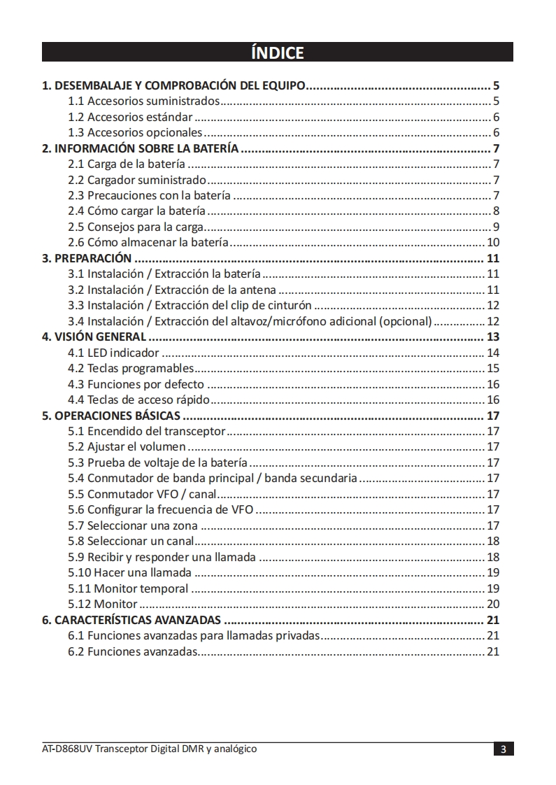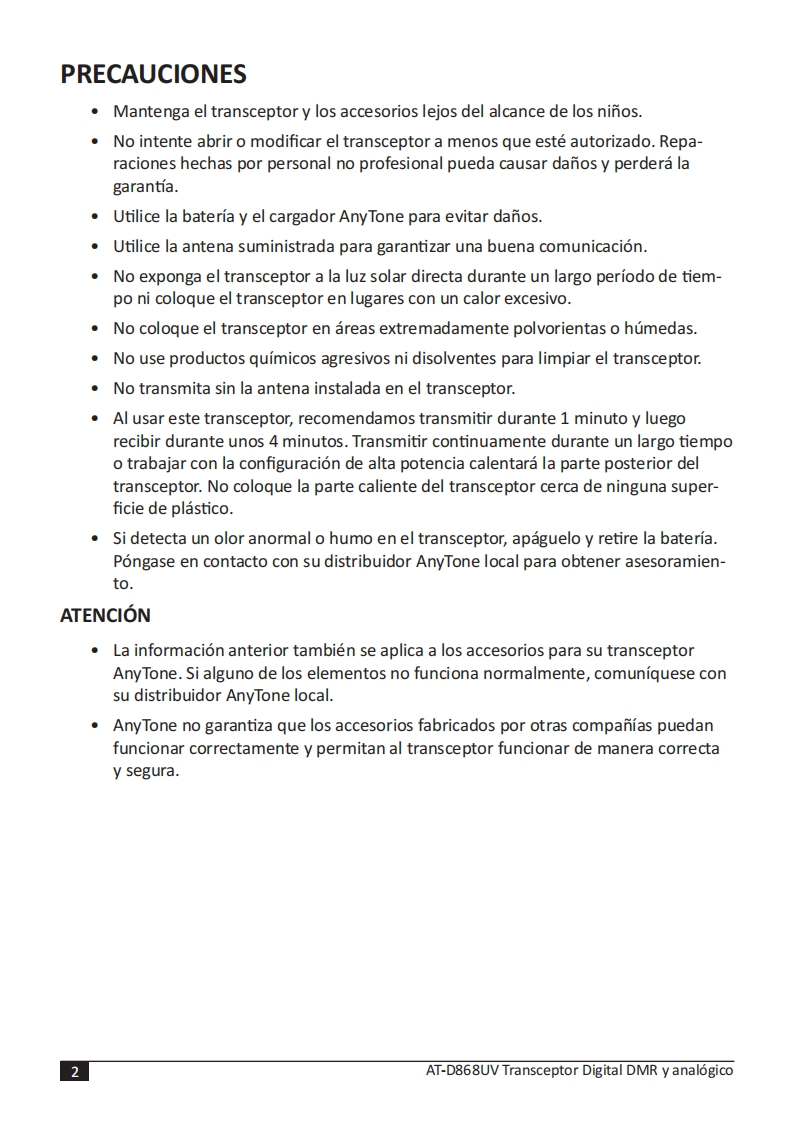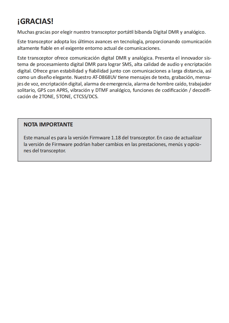 Manual_AT-D868UV_es操作说明书手册找手册网4天前更新关注私信1.50MB44页046Manual_AT-D868UV_es操作说明书手册此内容为付费资源,请付费后查看¥19¥23黄金会员免费钻石会员免费立即购买您当前未登录!建议登陆后购买,可保存购买订单付费资源 第1页 / 共44页 第2页 / 共44页 第3页 / 共44页 第4页 / 共44页 第5页 / 共44页 试读已结束,还剩39页,您可下载完整版后进行离线阅读 THE END自由通/灵通 文本预览 KnyToneAT-D868UVTransceptor portatil analogico/digital DMRbibanda(VHF/UHF)para radioaficionados.MANUAL DE INSTRUCCIONESDMRDIGITAL MOBILE RADIO ASSOCIATIONAnyTone凋6000000d600∞000d0+#(€ 查看更多 收起部分 喜欢就支持一下吧收藏